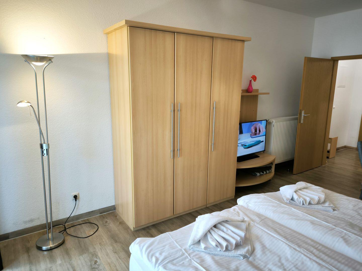 kombinierter Wohn- / Schlafraum mit Doppelbett (180 x 200 cm), Nachttischen, großem Kleiderschrank, Tisch mit 2 Ledersesseln, Anrichte mit TV, Kofferablage