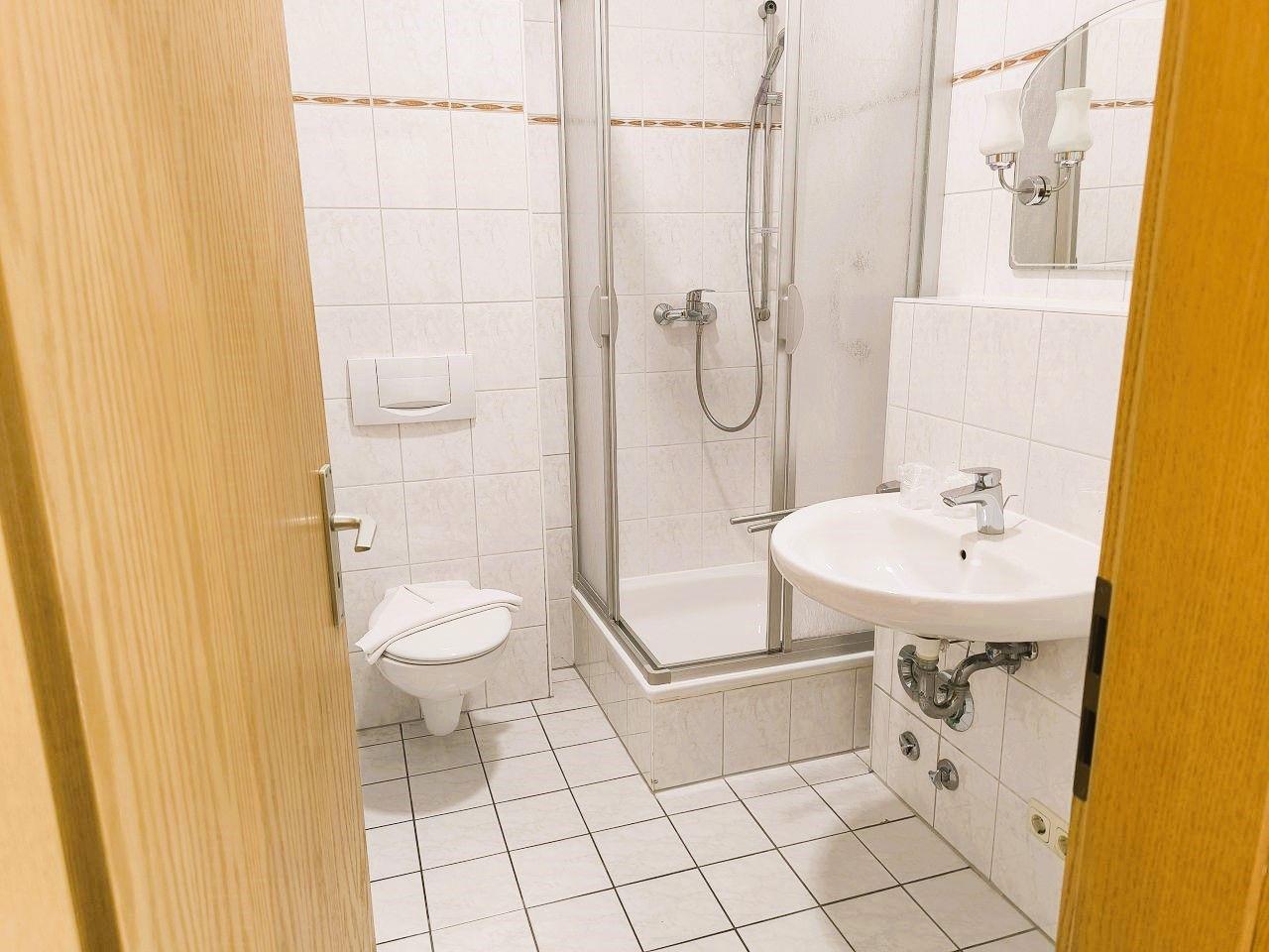 Bad mit Dusche, WC, Föhn und beleuchtetem Kosmetikspiegel
