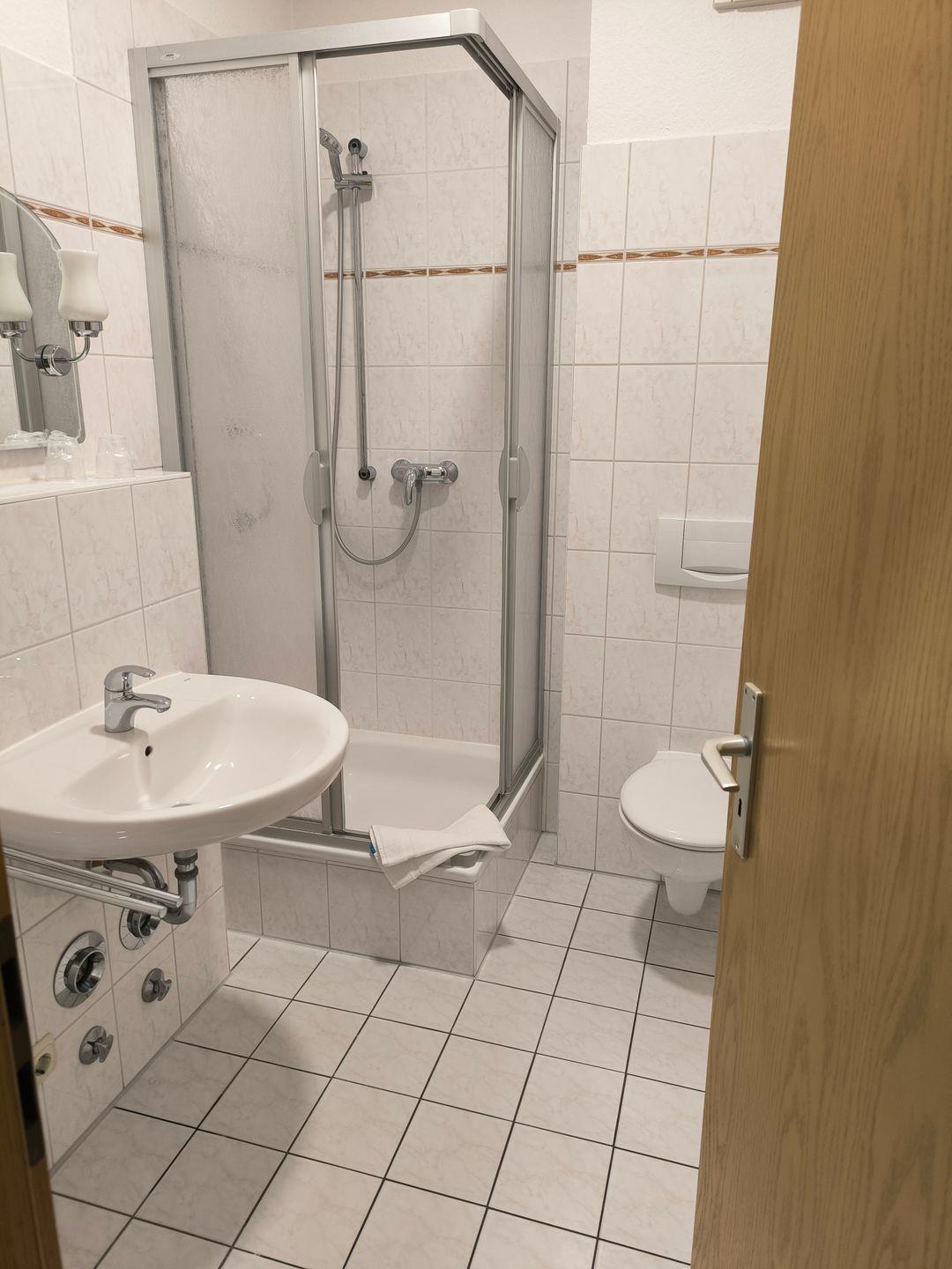Bad mit Dusche, WC, Föhn und beleuchtetem Kosmetikspiegel