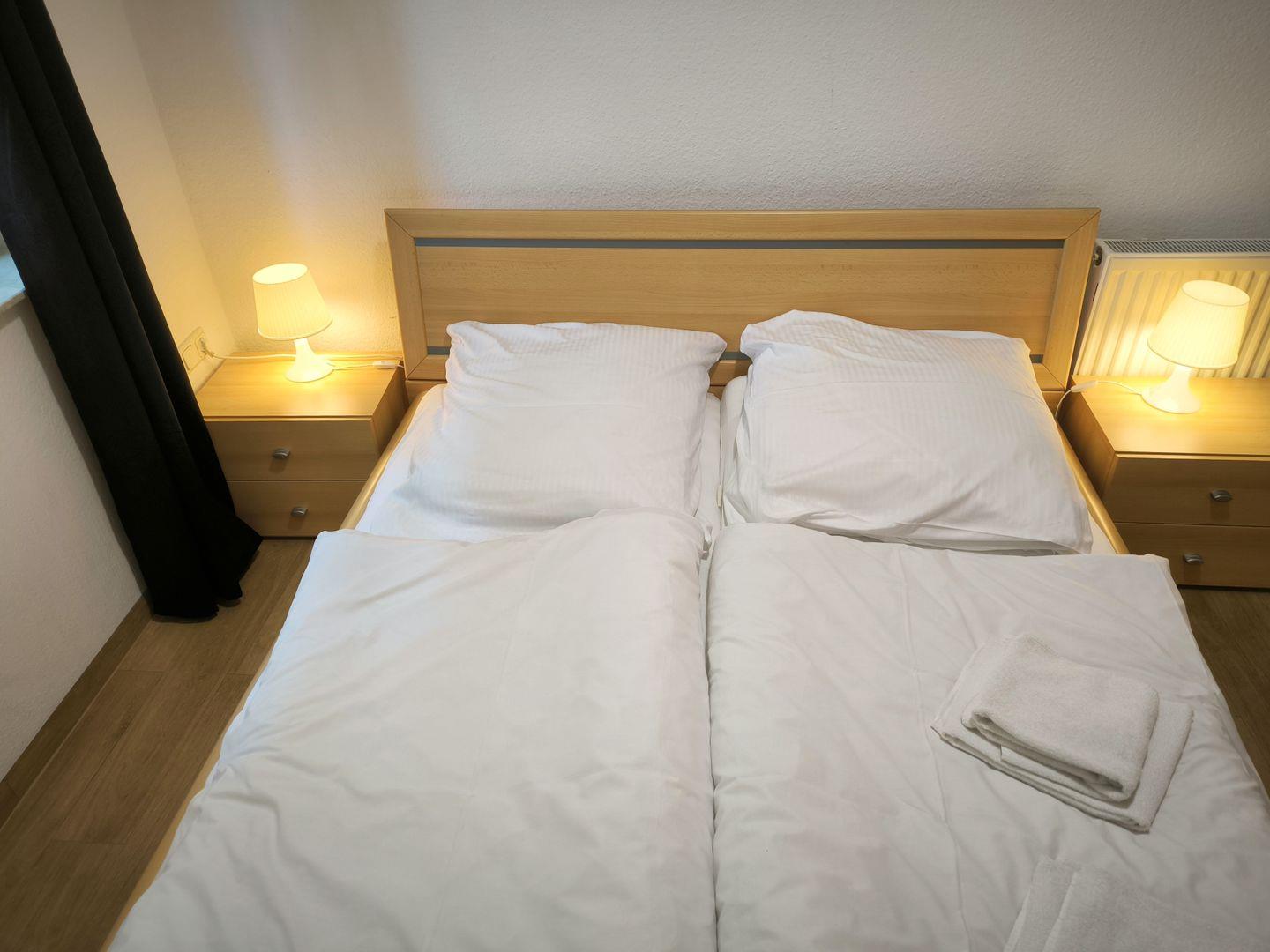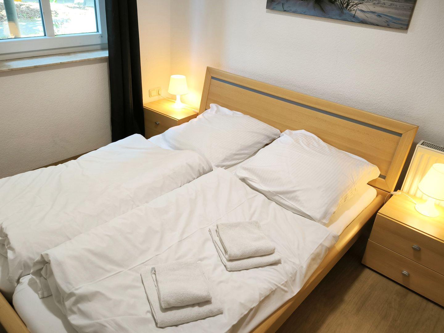 Schlafzimmer mit Doppelbett (180 x 200 cm), Nachttischen, großem Kleiderschrank, Kofferablage