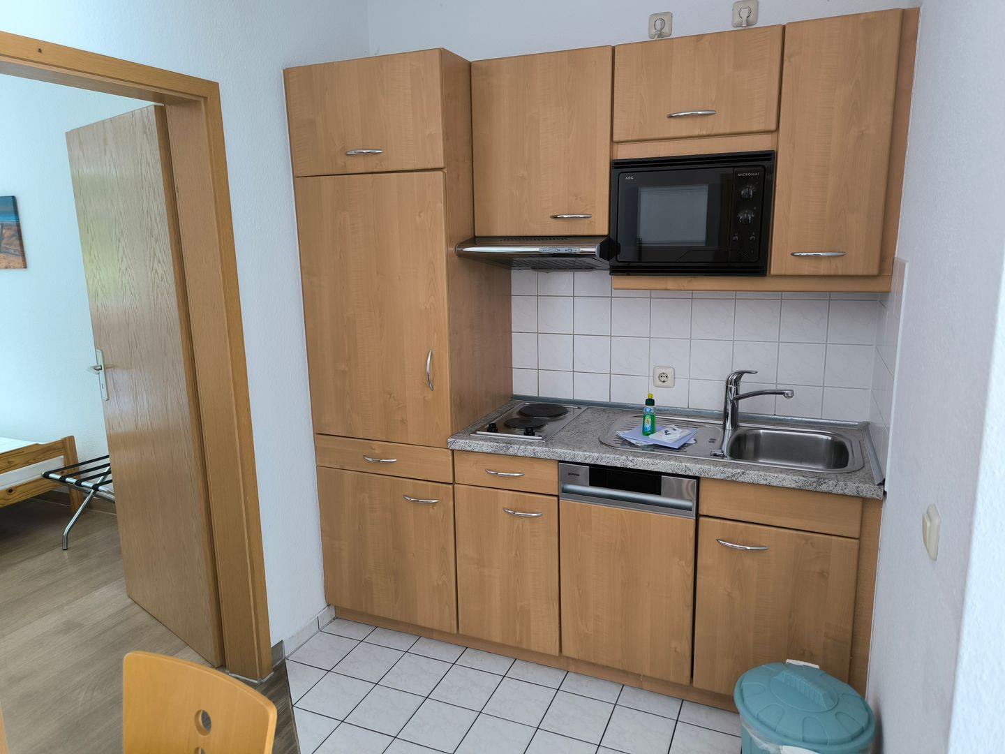 Im Wohnraum integrierte Einbauküche, ausgestattet mit: 2-Platten-Kochfeld, Mikrowelle, Dunstabzugshaube, Kühlschrank mit Gefrierfach, Geschirrspüler, Toaster, Kaffeemaschine, Wasserkocher und Küchenutensilien