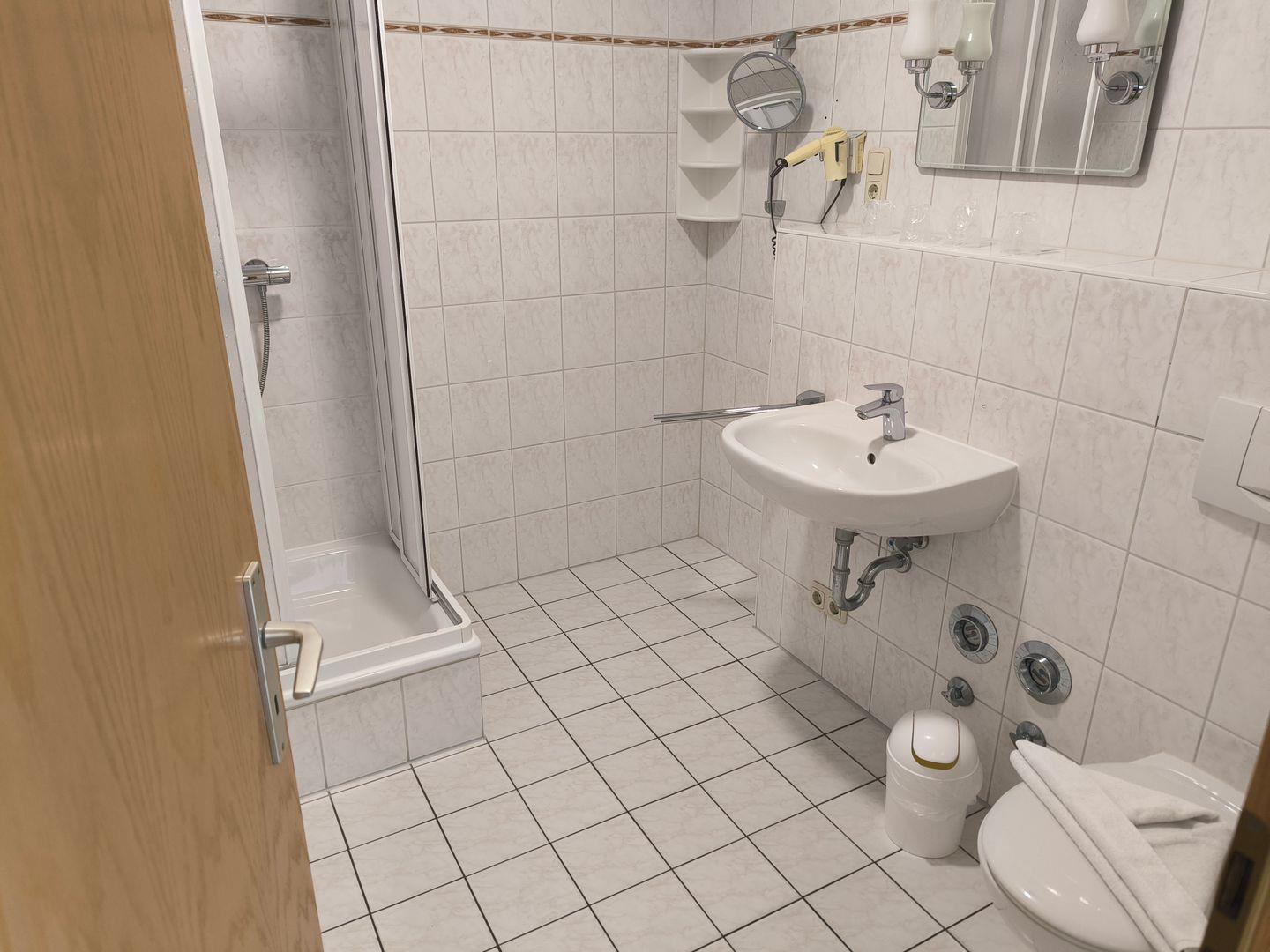 Bad mit Dusche, WC, Föhn und beleuchtetem Kosmetikspiegel