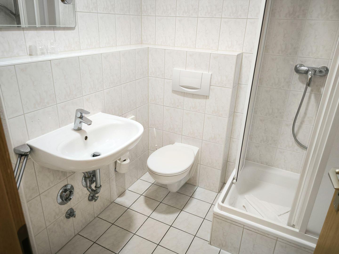 Bad mit Dusche, WC, Föhn und beleuchtetem Kosmetikspiegel