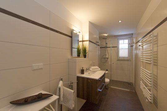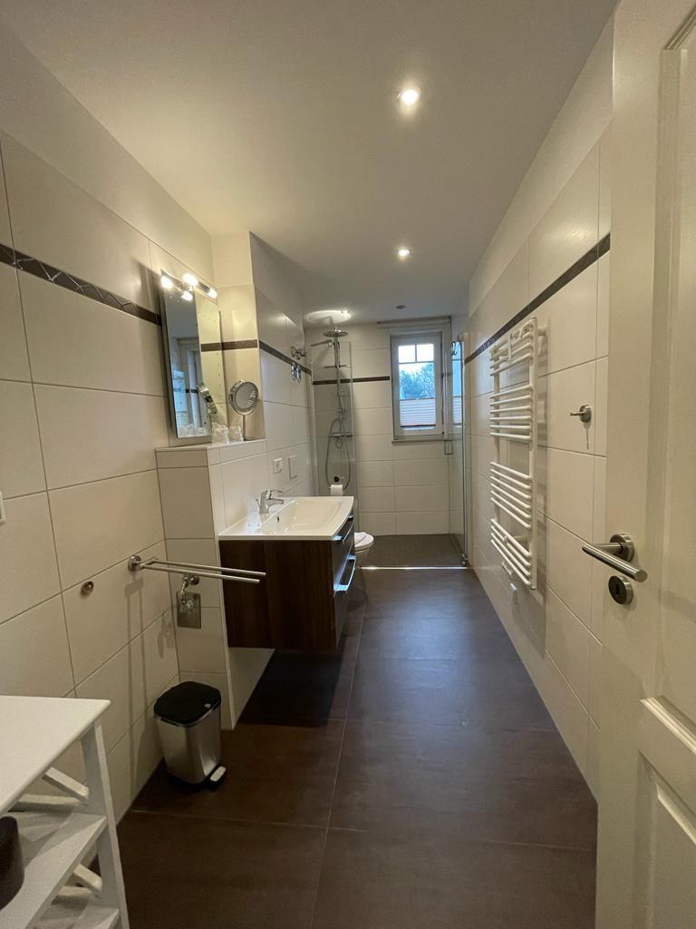 Bad mit großer ebenerdiger Dusche, WC und Föhn