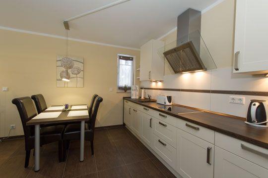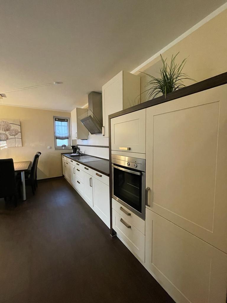 In den Wohnraum integrierte Einbauküche mit 4-Platten-Cerankochfeld, Backofen, Mikrowelle, Kühlschrank mit Gefrierfach, Geschirrspüler, Toaster, Kaffeemaschine, Wasserkocher, Eierkocher und hochwertigen Küchenutensilien