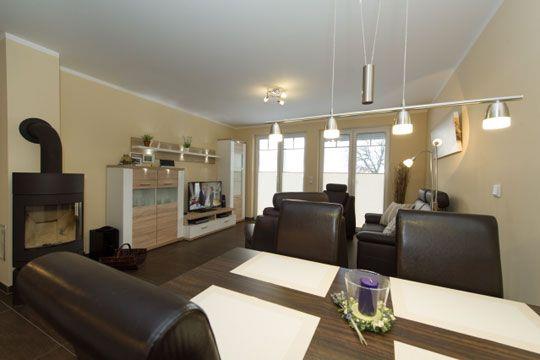 Wohnbereich mit Ledersitzgarnitur und Couchtisch, TV und CD-Radio, Esstisch mit 4 Stühlen und Kamin