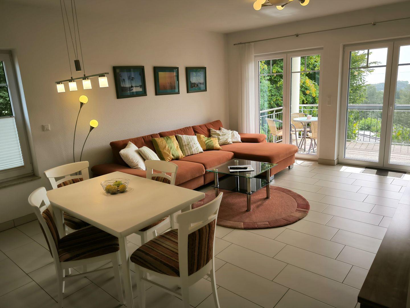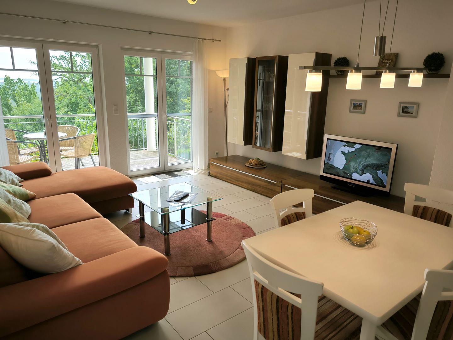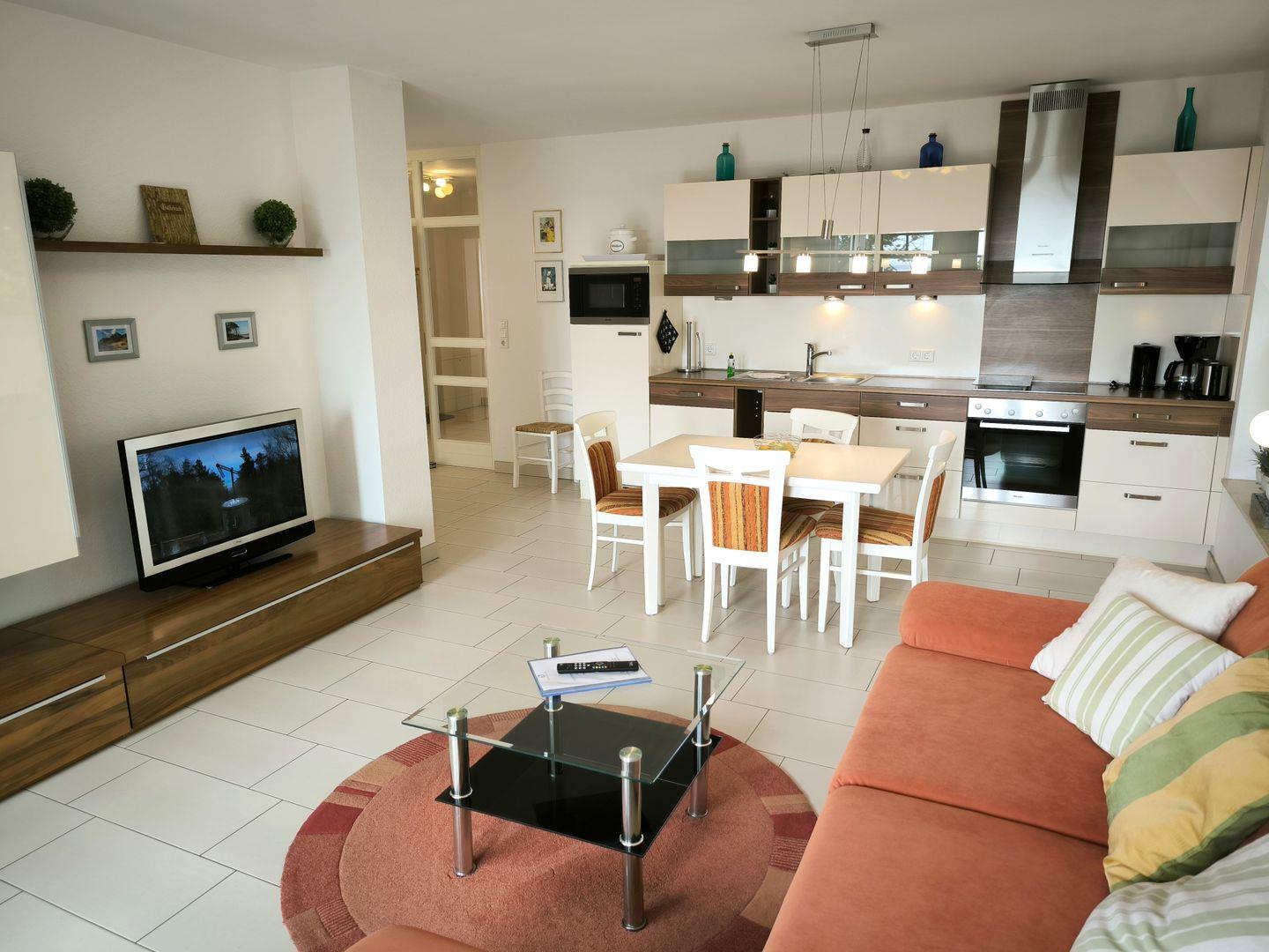 Großzügiger Wohnbereich mit Eckcouch und Couchtisch, TV und CD-Radio, Esstisch mit 4 Stühlen