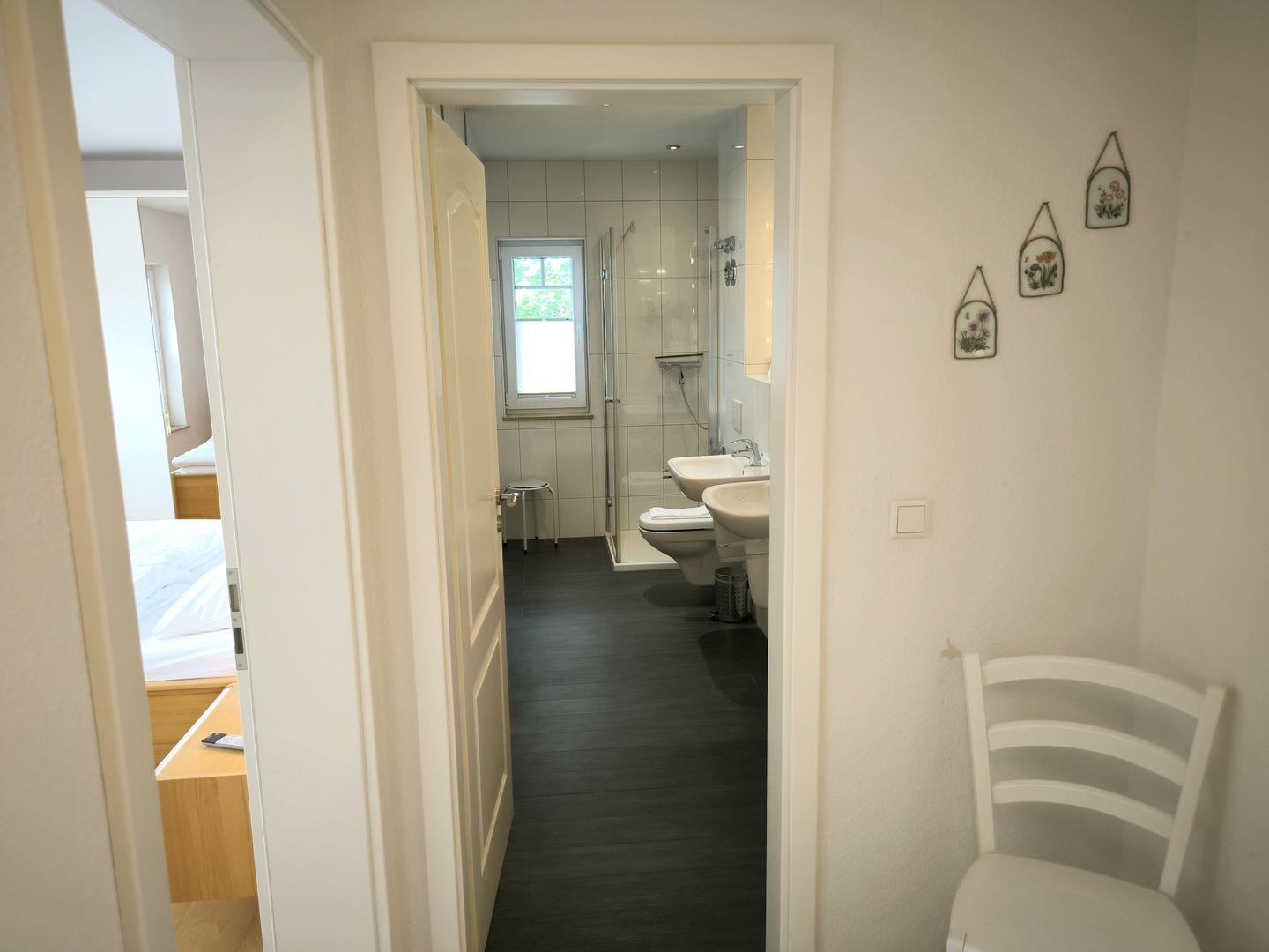 Bad mit großer ebenerdiger Dusche, 2 Waschtischen, WC und Föhn