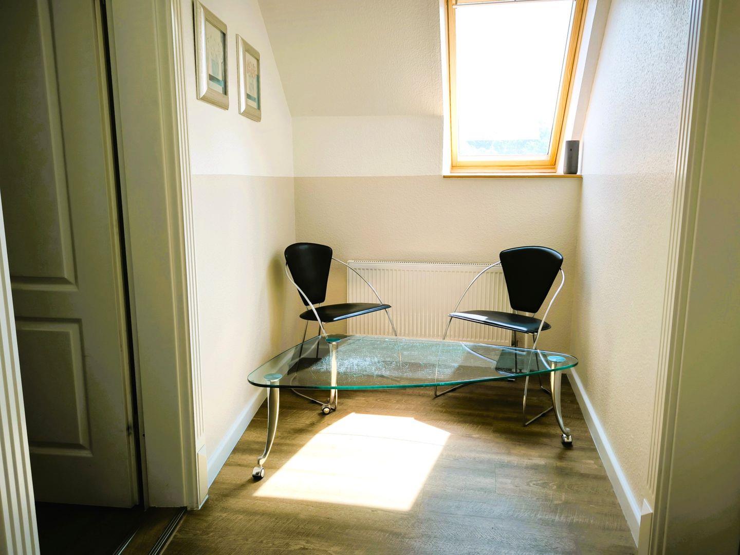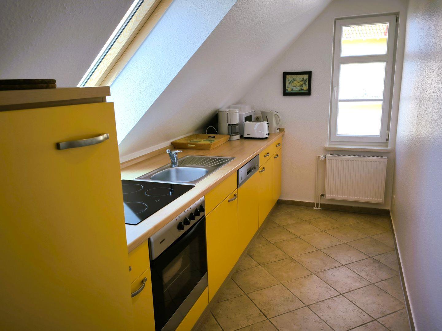 separate Küche mit 4- Platten- Kochfeld, Backofen, Kühlschrank, Toaster, Kaffeemaschine, Wasserkocher und Küchenutensilien