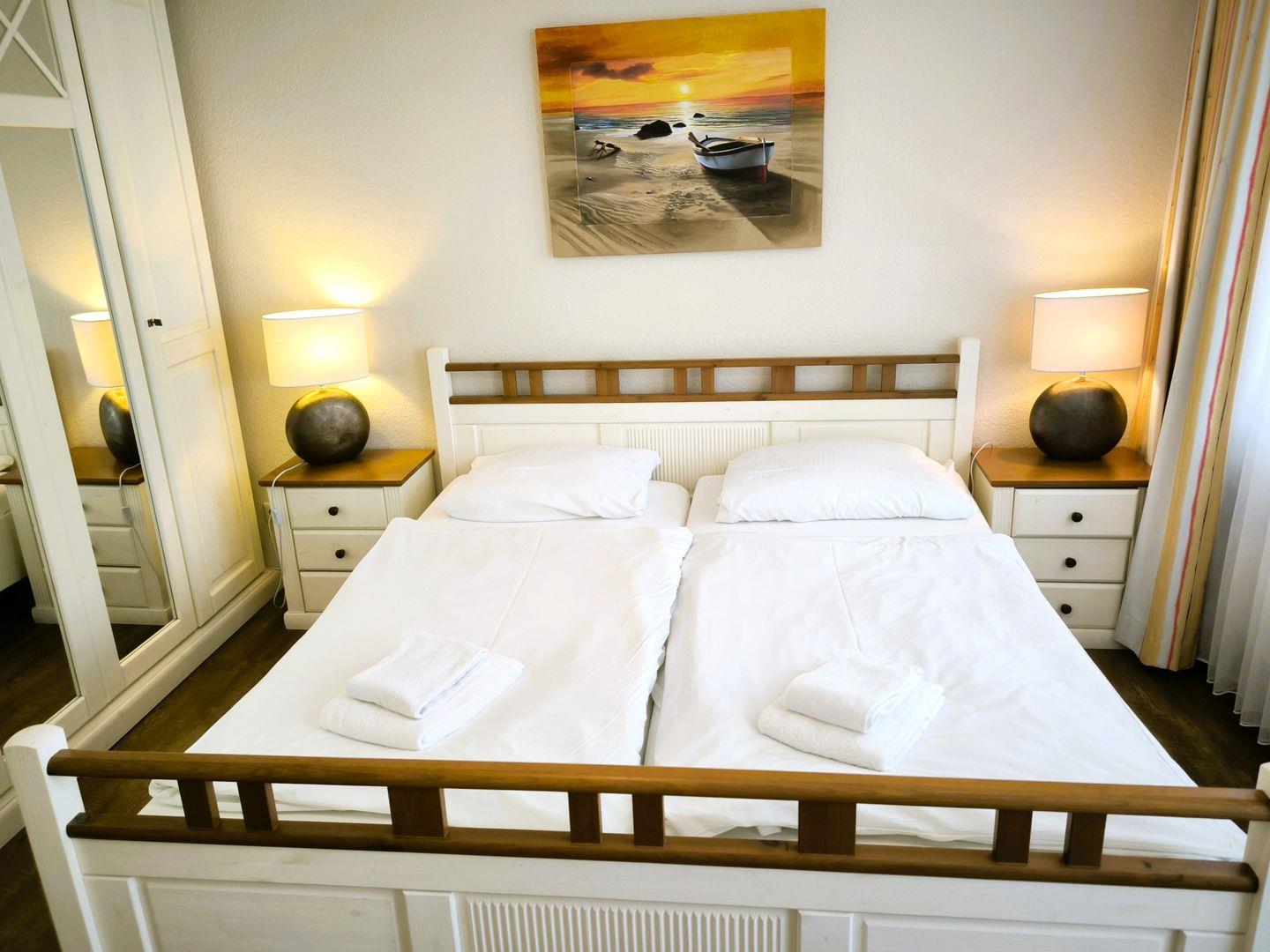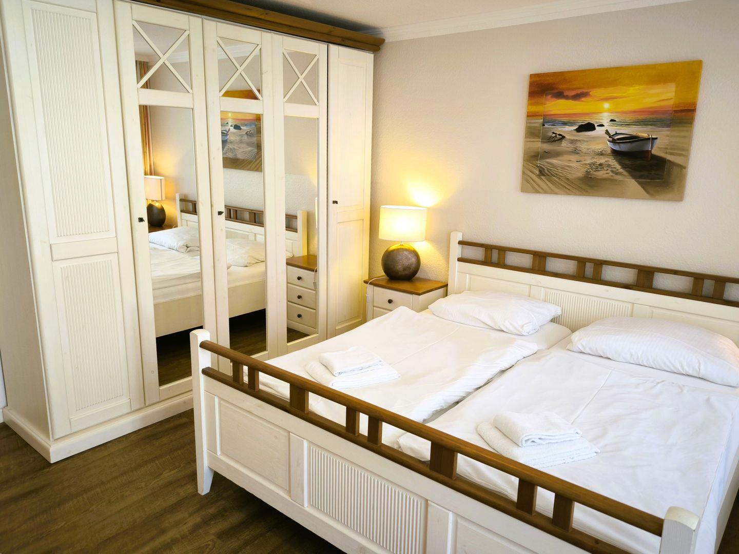 Schlafzimmer mit einem Doppelbett (180 x 200 cm), großem Kleiderschrank