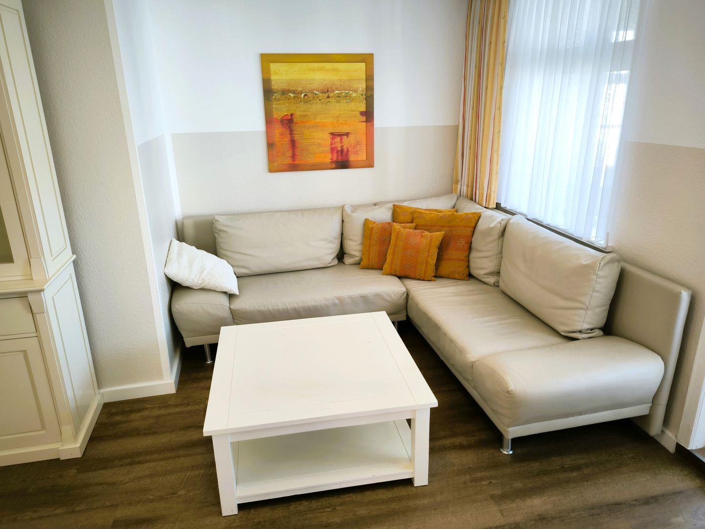 Wohnbereich mit moderner Wohnlandschaft, ausziehbarer Couch, Couchtisch, LED-TV, Radio