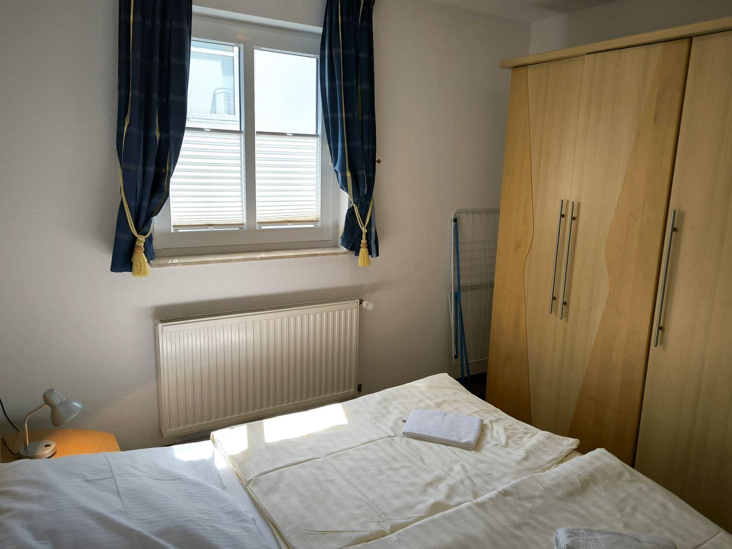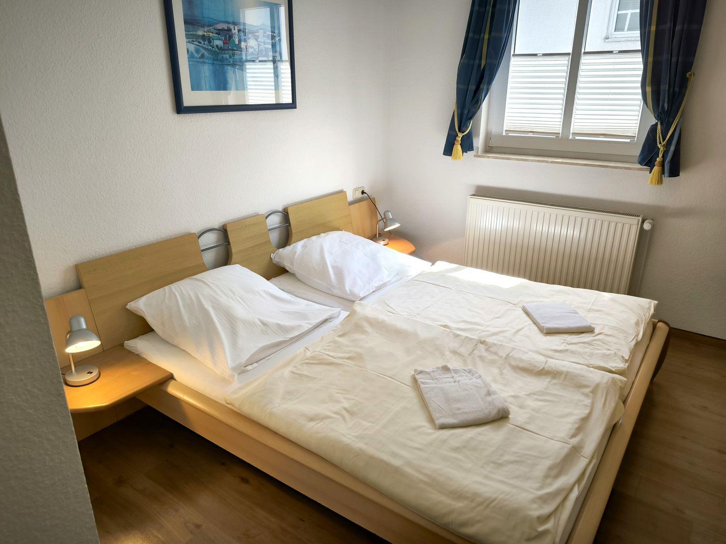 Schlafzimmer mit einem Doppelbett (180 x 200 cm) und großem Kleiderschrank, Kofferablage