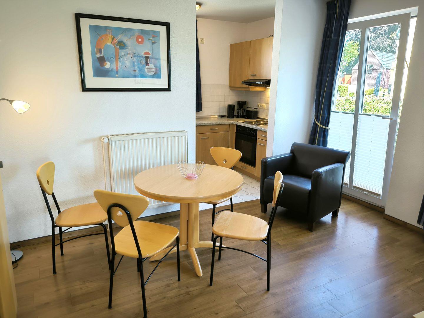 Wohnbereich mit ausziehbarer, moderner Doppelbettschlafcouch, Couchtisch mit Sesseln, Flat-TV mit Radiofunktion ,Esstisch mit 4 Stühlen