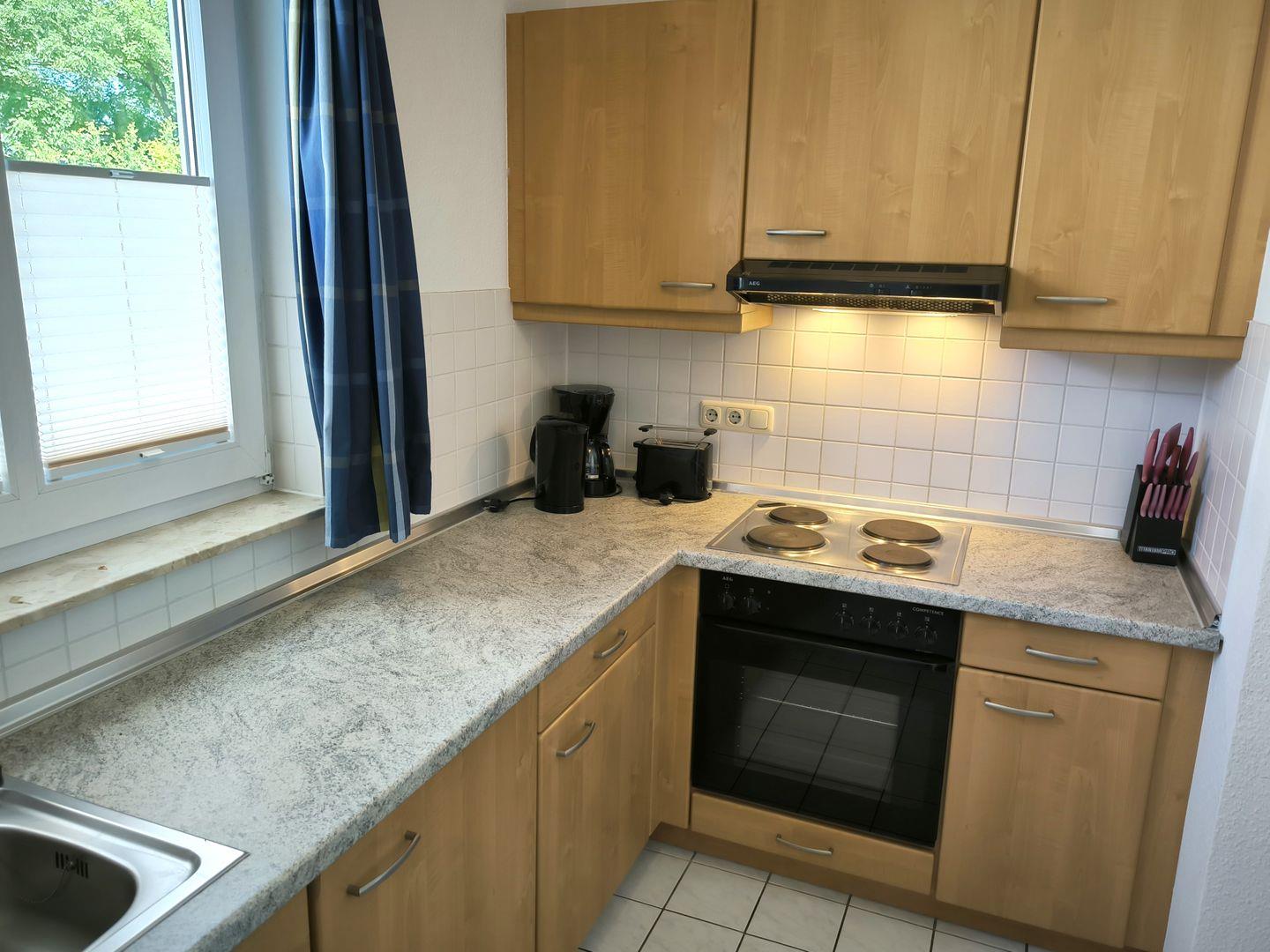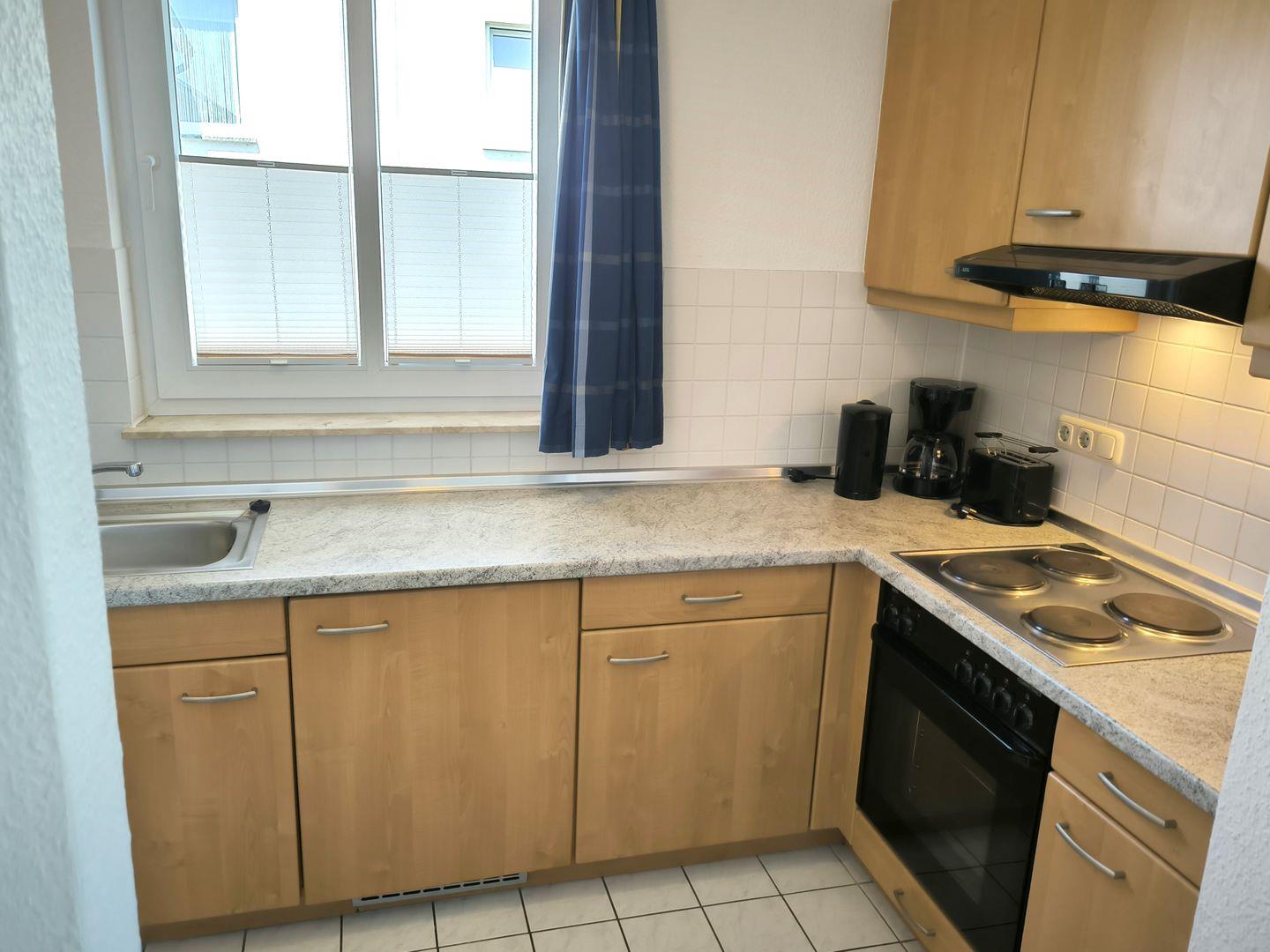 Im Wohnraum integrierte Einbauküche mit: 4-Platten-Kochfeld, Backofen, Kühlschrank mit Gefrierfach, Geschirrspüler, Toaster, Kaffeemaschine, Wasserkocher und Küchenutensilien