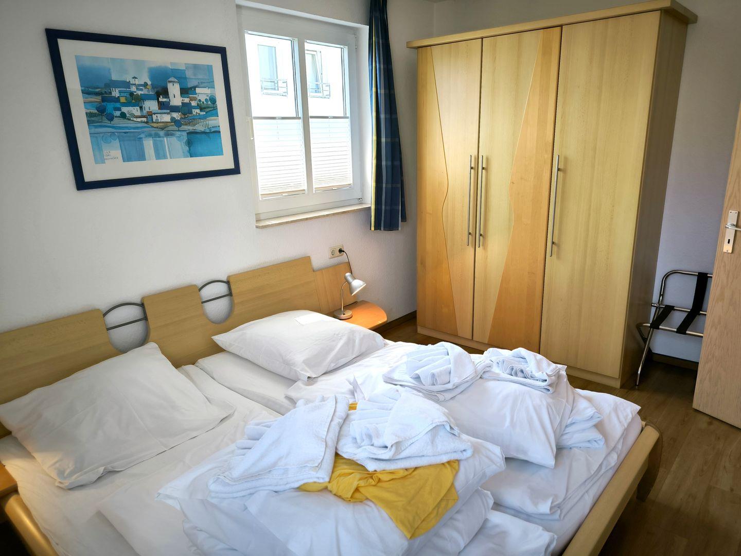 Schlafzimmer mit einem Doppelbett (180 x 200 cm) und großem Kleiderschrank, Kofferablage