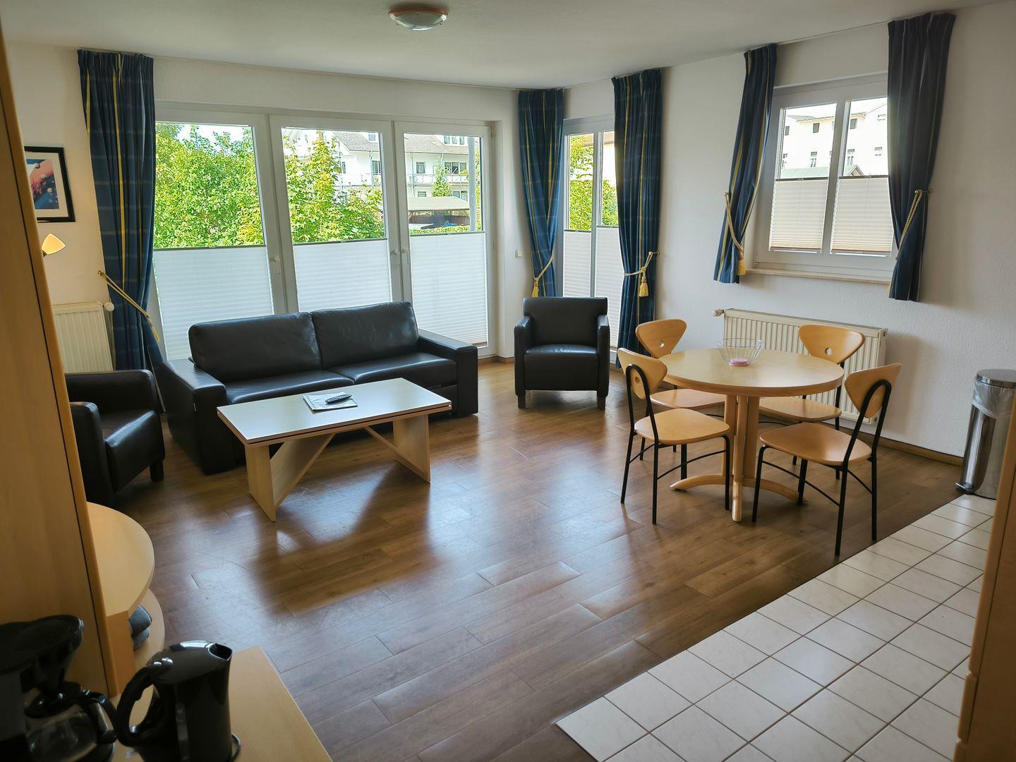 Wohnbereich mit ausziehbarer, moderner Doppelbettschlafcouch, Couchtisch mit Sesseln, Flat-TV mit Radiofunktion ,Esstisch mit 4 Stühlen