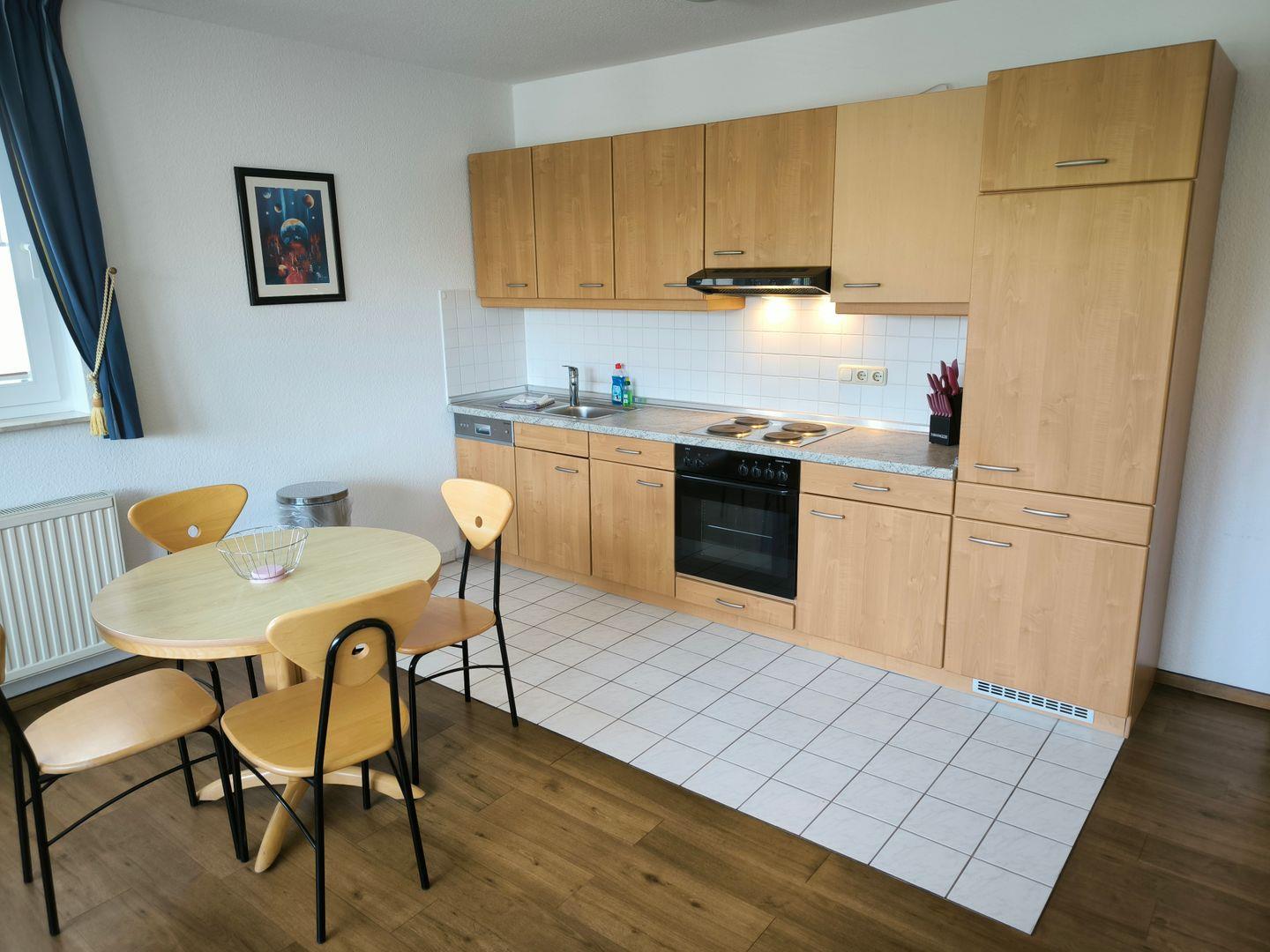 Im Wohnraum integrierte Einbauküche mit 4-Platten-Kochfeld, Backofen, Kühlschrank mit Gefrierfach, Geschirrspüler, Toaster, Kaffeemaschine, Wasserkocher und Küchenutensilien
