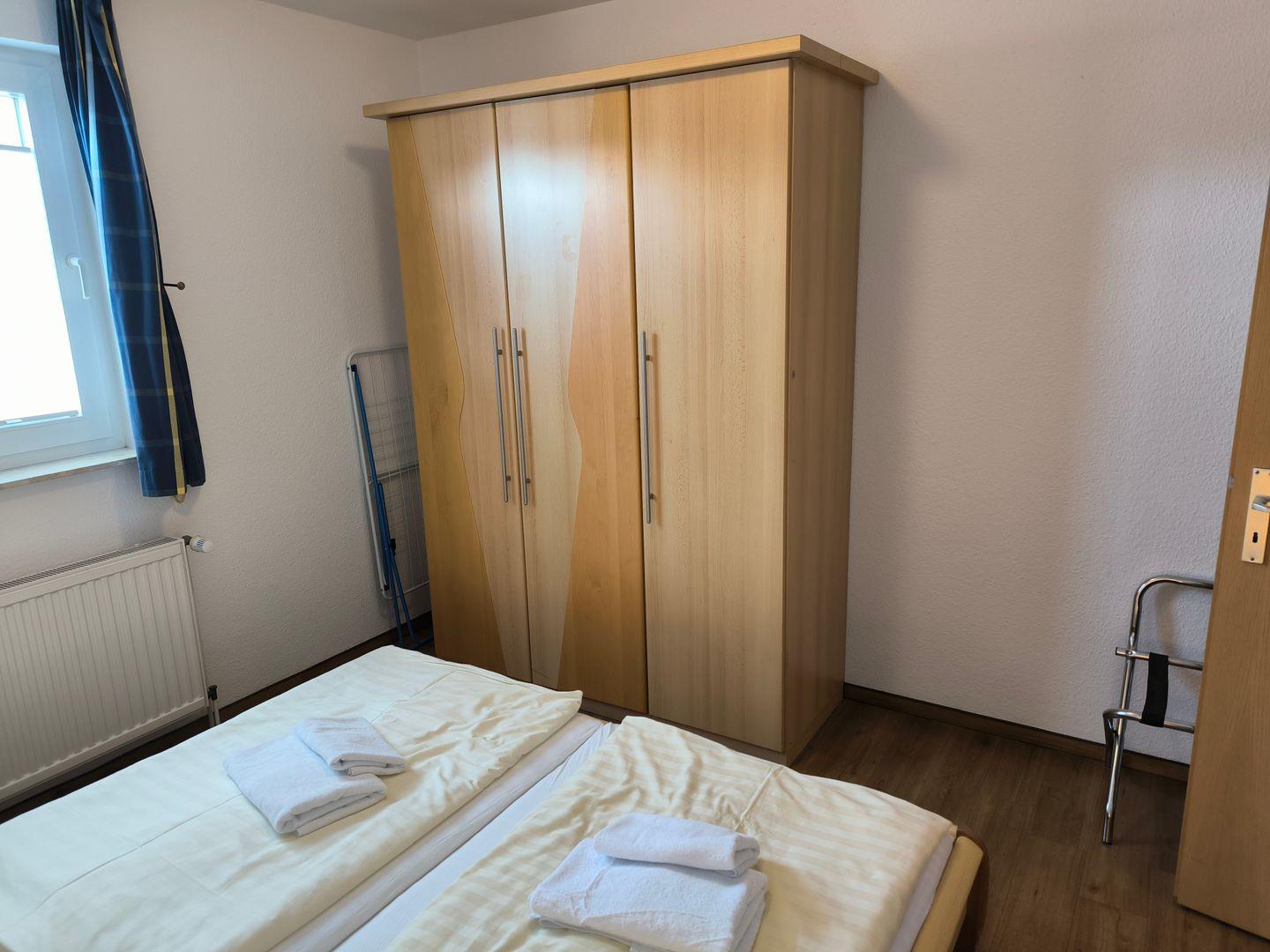 Schlafzimmer mit einem Doppelbett (180 x 200 cm) und großem Kleiderschrank, Kofferablage