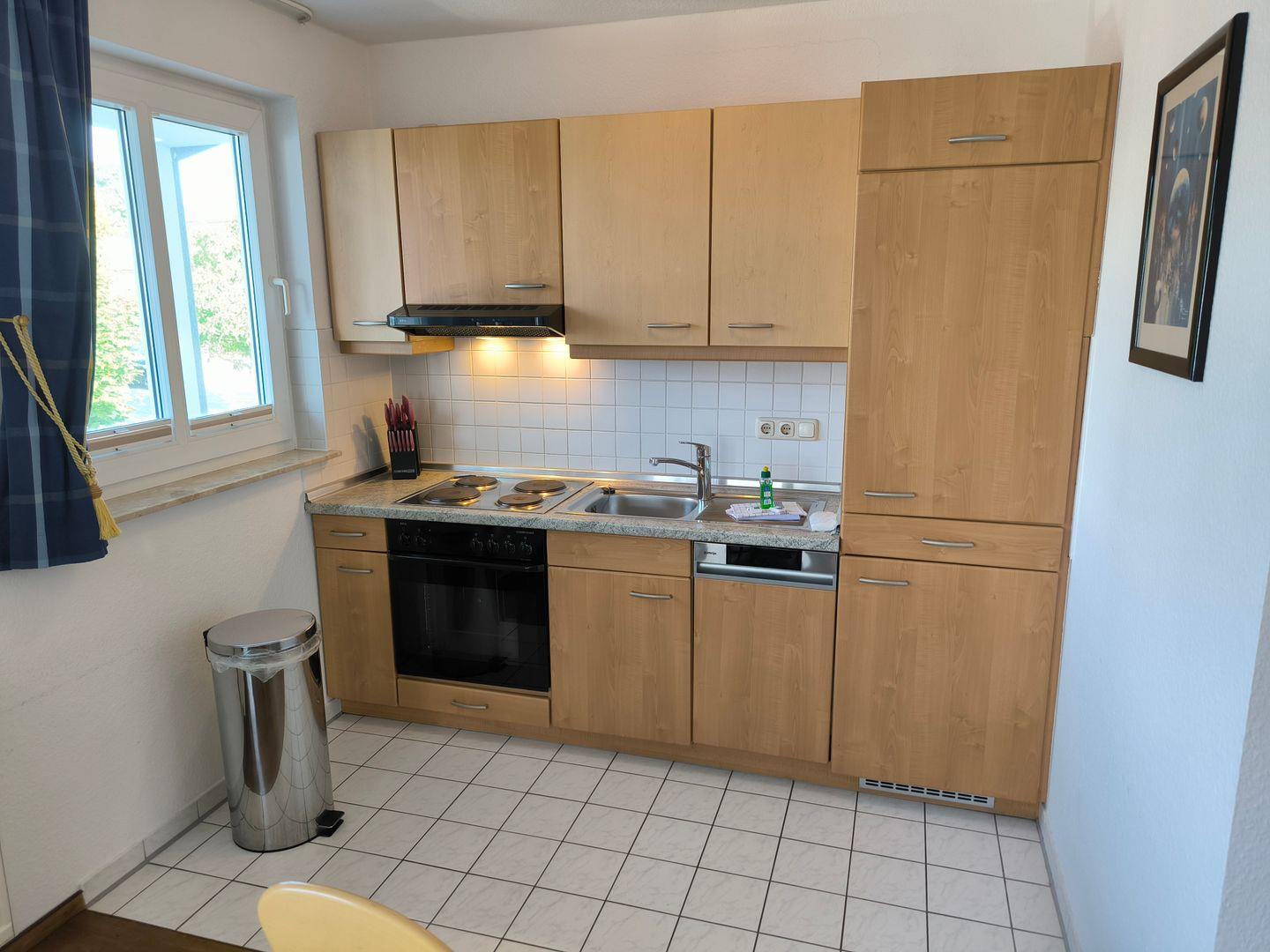 In den Wohnraum integrierte Einbauküche mit 4-Platten-Kochfeld, Backofen, Kühlschrank mit Gefrierfach, Geschirrspüler, Toaster, Kaffeemaschine, Wasserkocher und Küchenutensilien