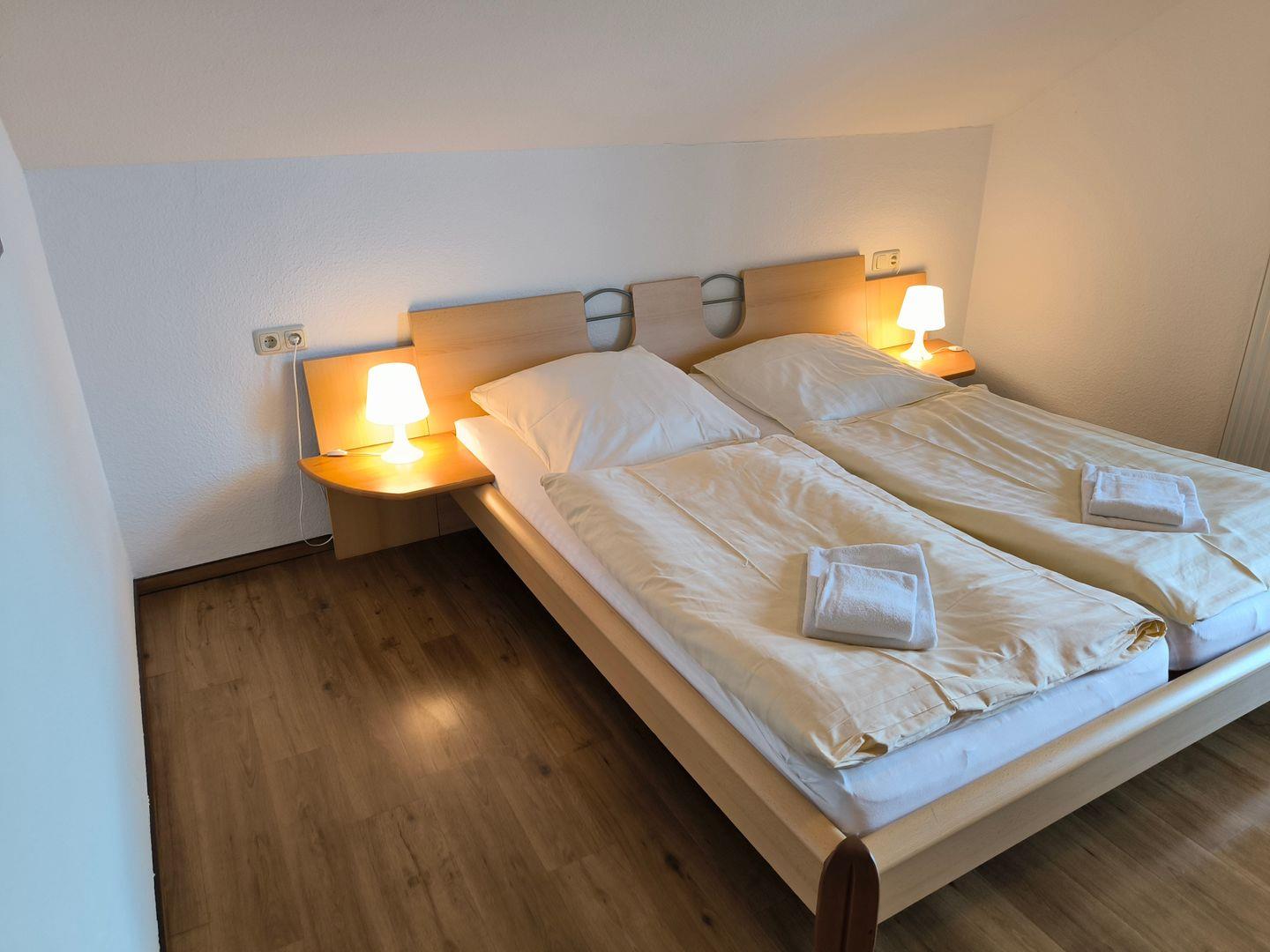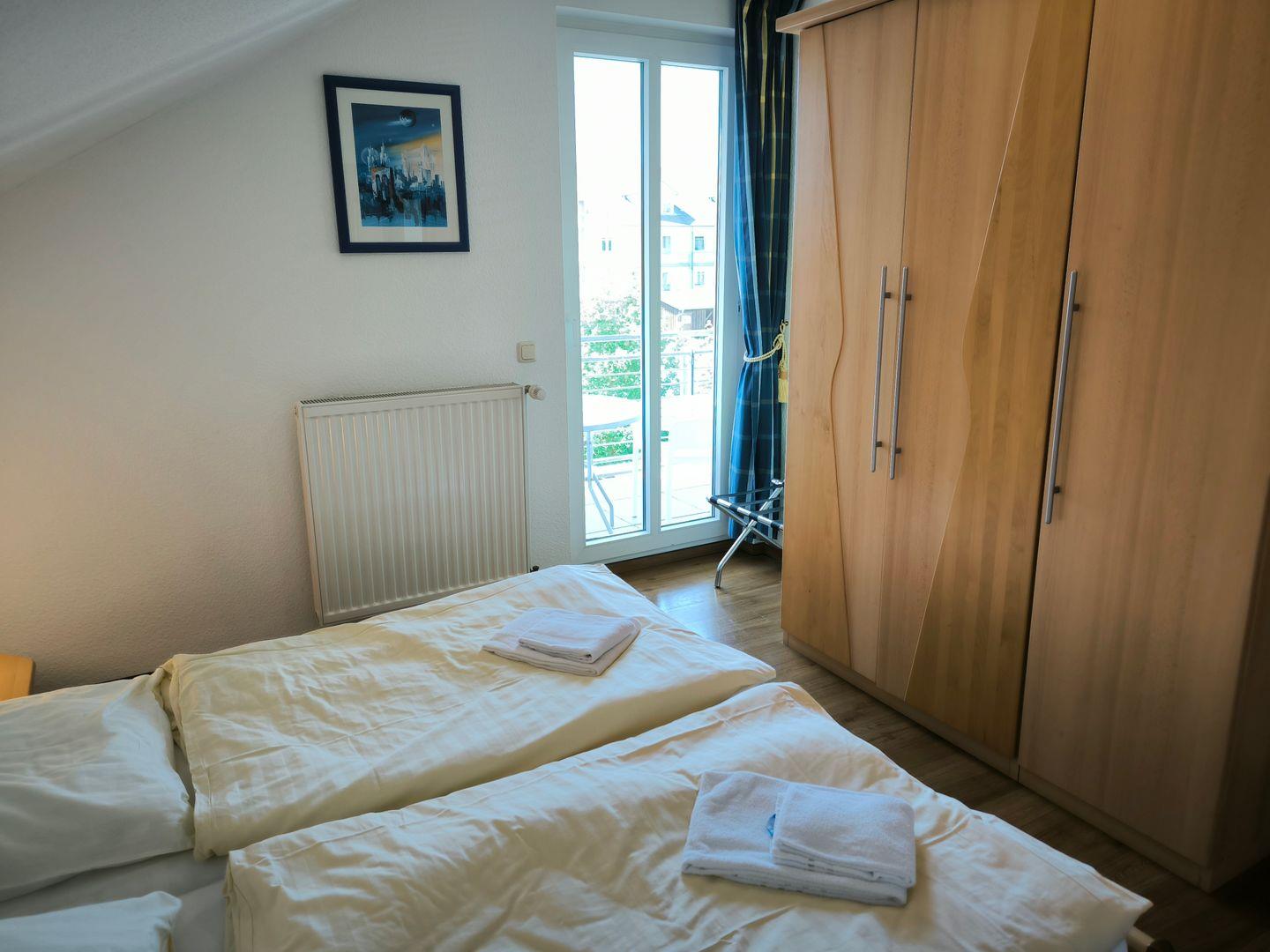 Schlafzimmer mit einem Doppelbett (180 x 200 cm) und großem Kleiderschrank, Kofferablage