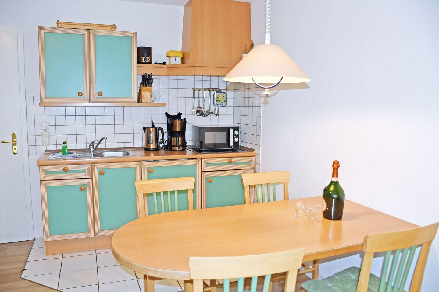 in den Wohnraum integrierte Einbauküche mit 4- Platten- Kochfeld, Backofen, Kühlschrank, Geschirrspüler, Toaster, Kaffeemaschine, Wasserkocher und Küchenutensilien