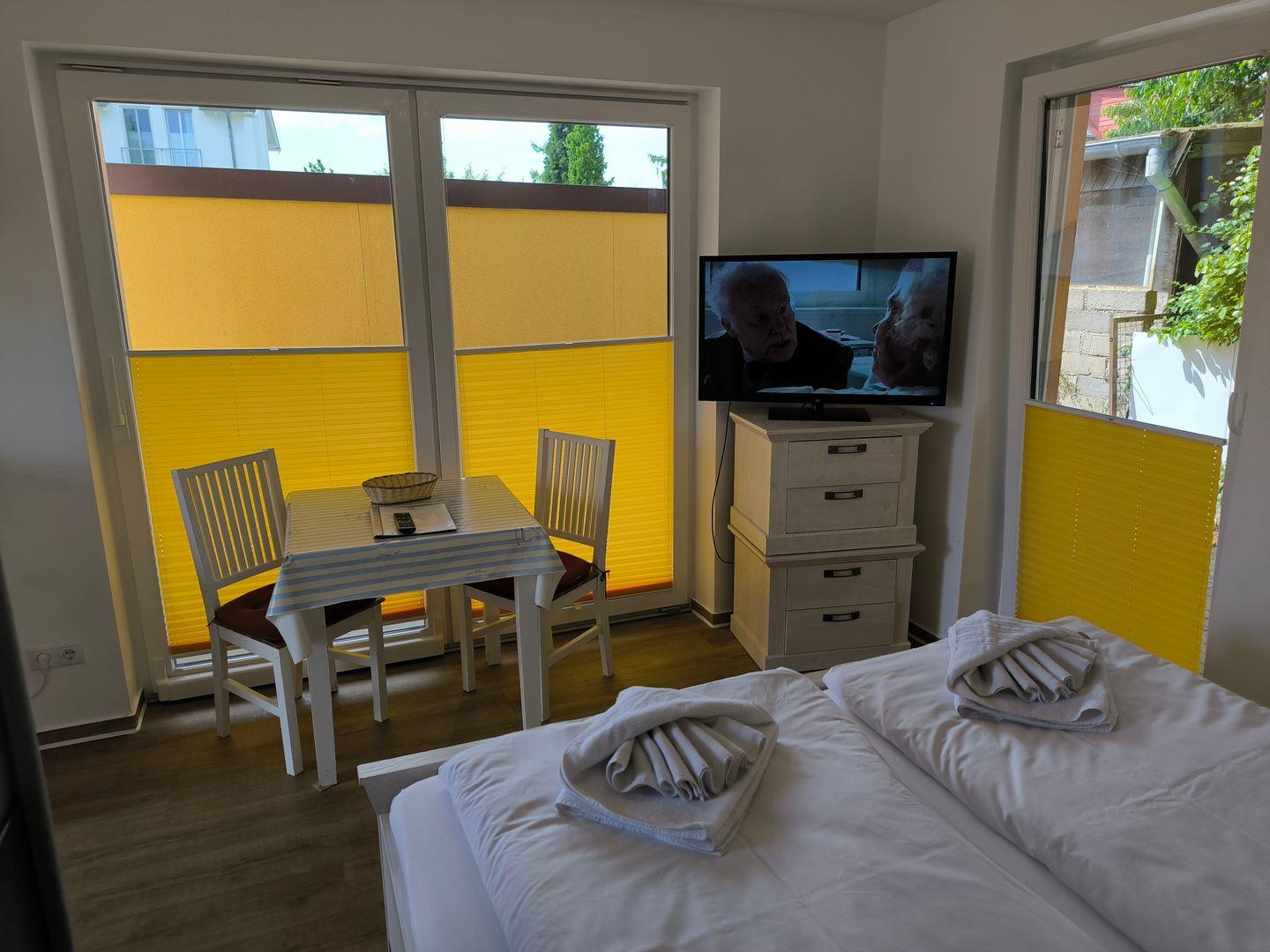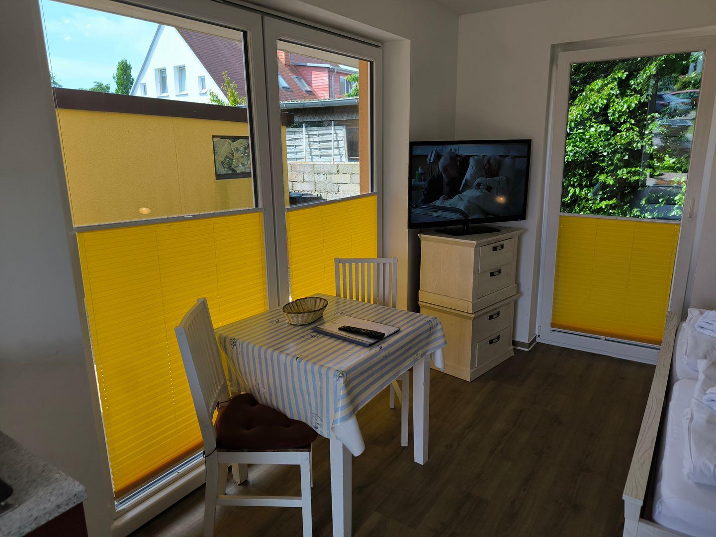 kombinierter Wohn-/ Schlafbereich mit Doppelbett ( 180×200 ) und Esstisch mit 2 Stühlen