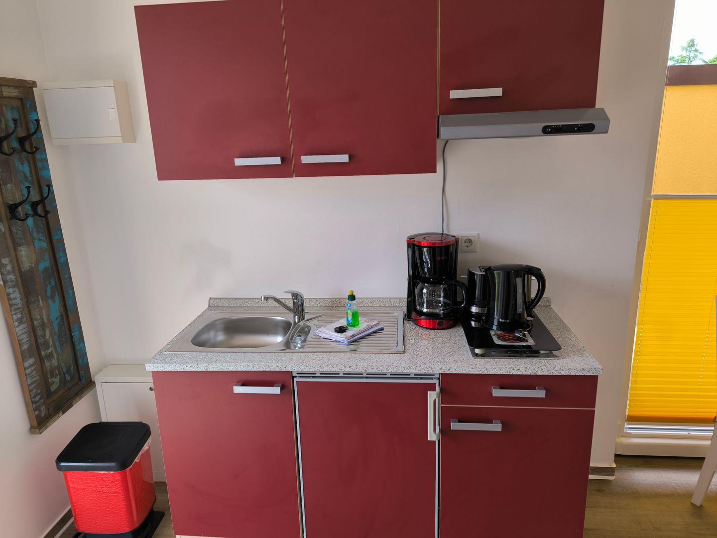 kleine integrierte Küchenzeile mit 2-Platten-Kochfeld, Backofen, Kühlschrank mit Gefrierfach, Toaster, Kaffeemaschine, Wasserkocher, diverse Küchenutensilien
