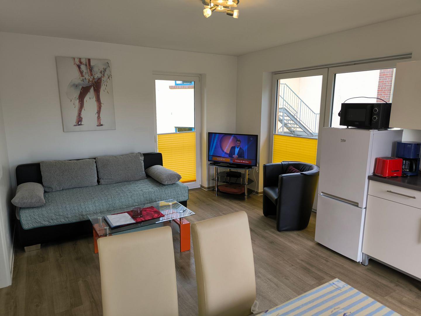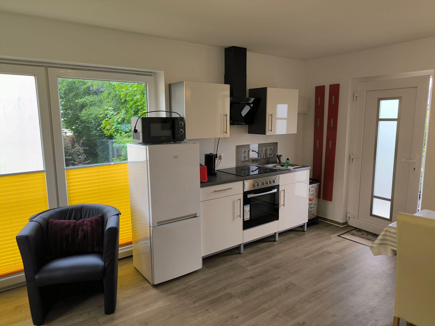 in den Wohnraum integrierte Küchenzeile mit 4-Platten-Ceran-Kochfeld, Backofen, Dunstabzugshaube, Kühlschrank mit Gefrierfach, Mikrowelle, Toaster, Kaffeemaschine, Wasserkocher, diverse Küchenutensilien