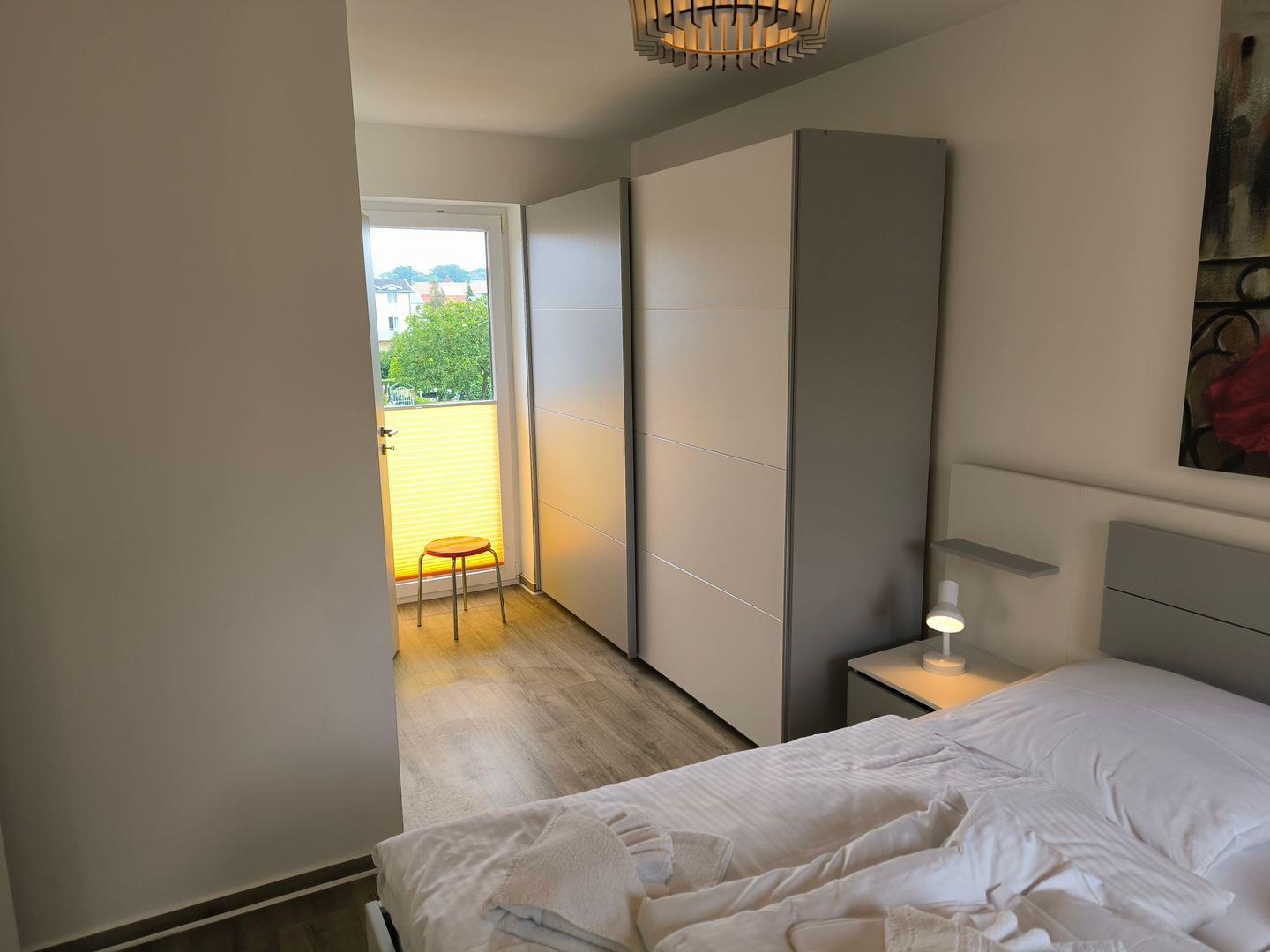Schlafzimmer mit Doppelbett (180x200cm) mit großen Kleiderschrank und Nachttisch