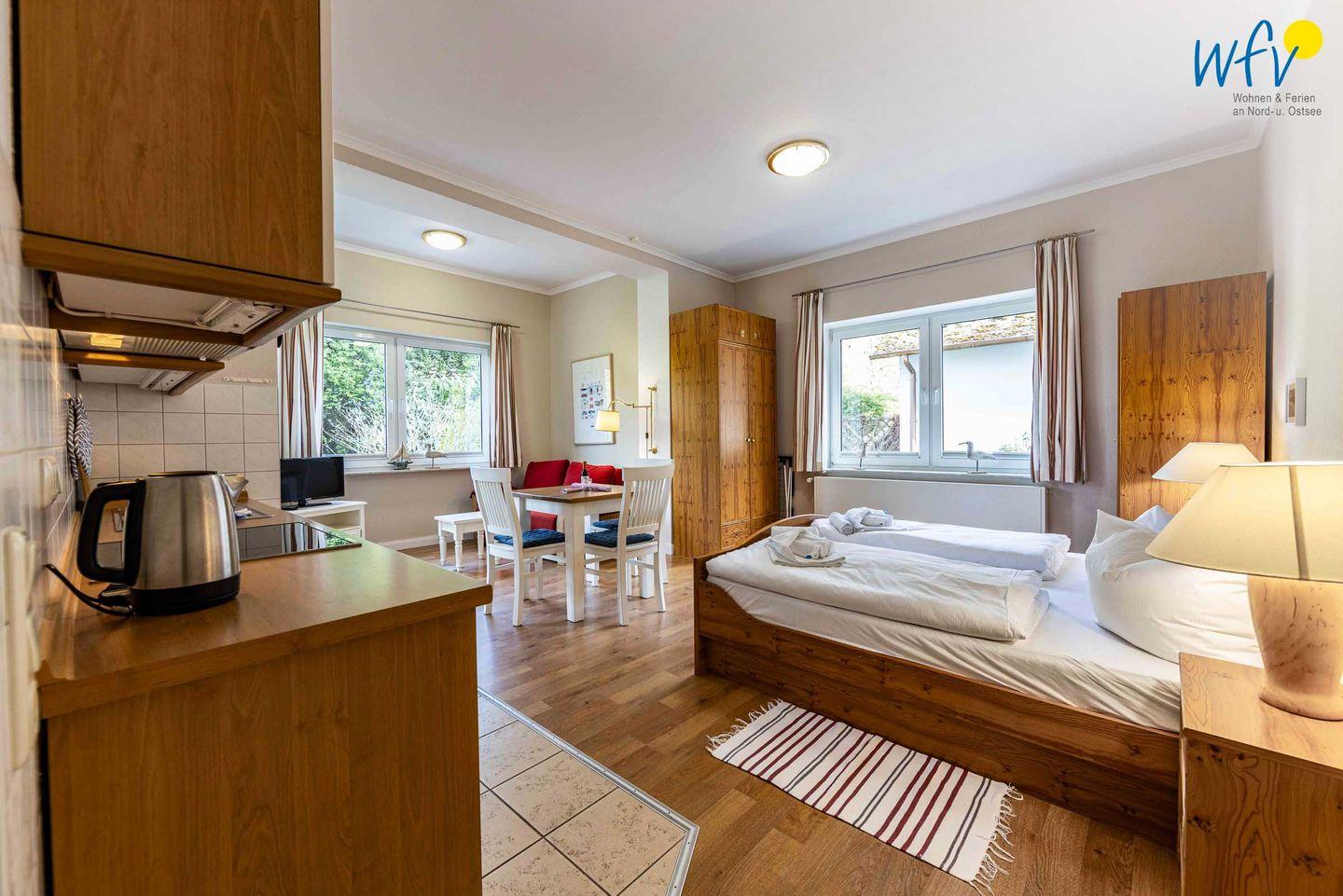 Auf 35 m² Wohnfläche erwartet Sie ein großzügiger Wohnraum mit Sitzecke, Esstisch, Doppelbett und integrierter Küchenzeile sowie ein Duschbad. Große Fenster verleihen der Ferienwohnung eine sehr freundliche und gemütliche Atmosphäre, durch die Sie sich auf Anhieb wohlfühlen werden. Von der Wohnung aus können Sie bereits die Ostsee sehen!