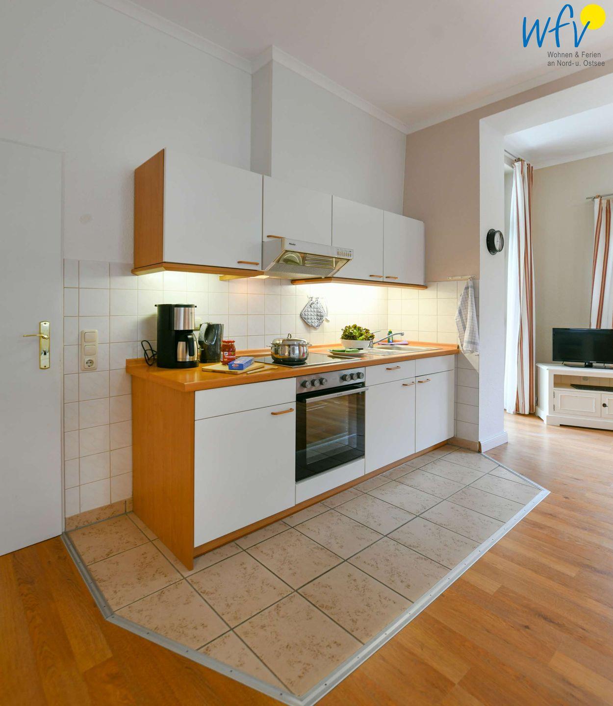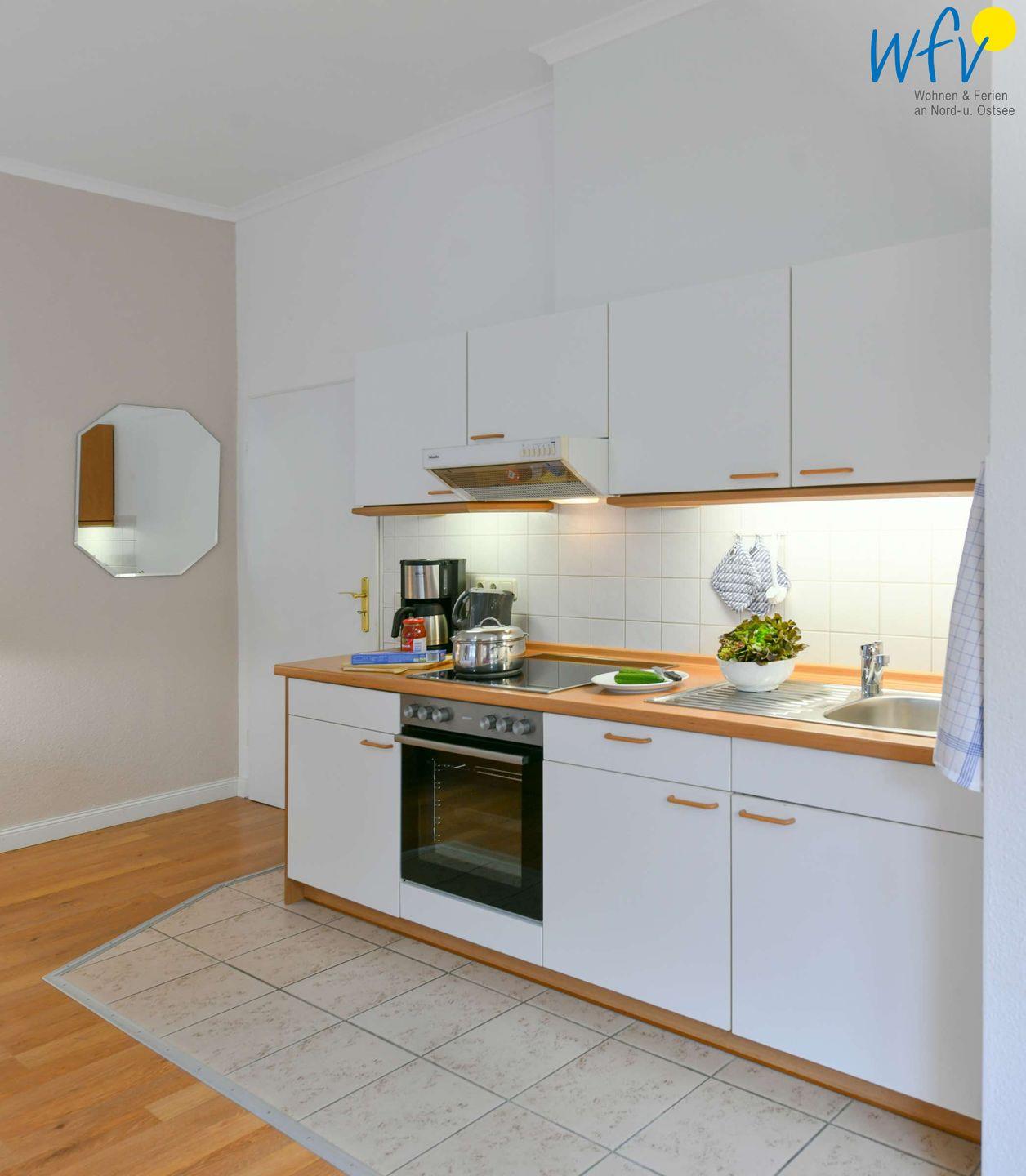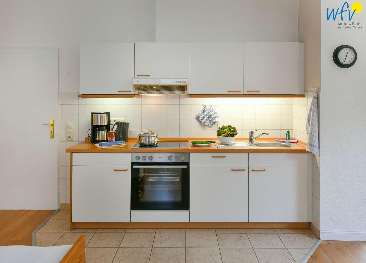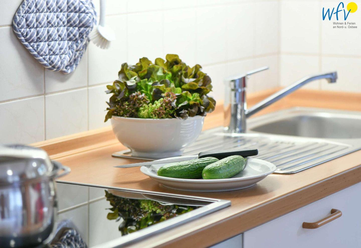 Für eine bequeme Selbstverpflegung ist die Küchenzeile der Rügener Ferienwohnung u.a. mit einem 4-Plattenherd, Backofen und Kühlschrank mit Gefrierfach sowie Kaffeemaschine, Wasserkocher und Toaster ausgestattet.
