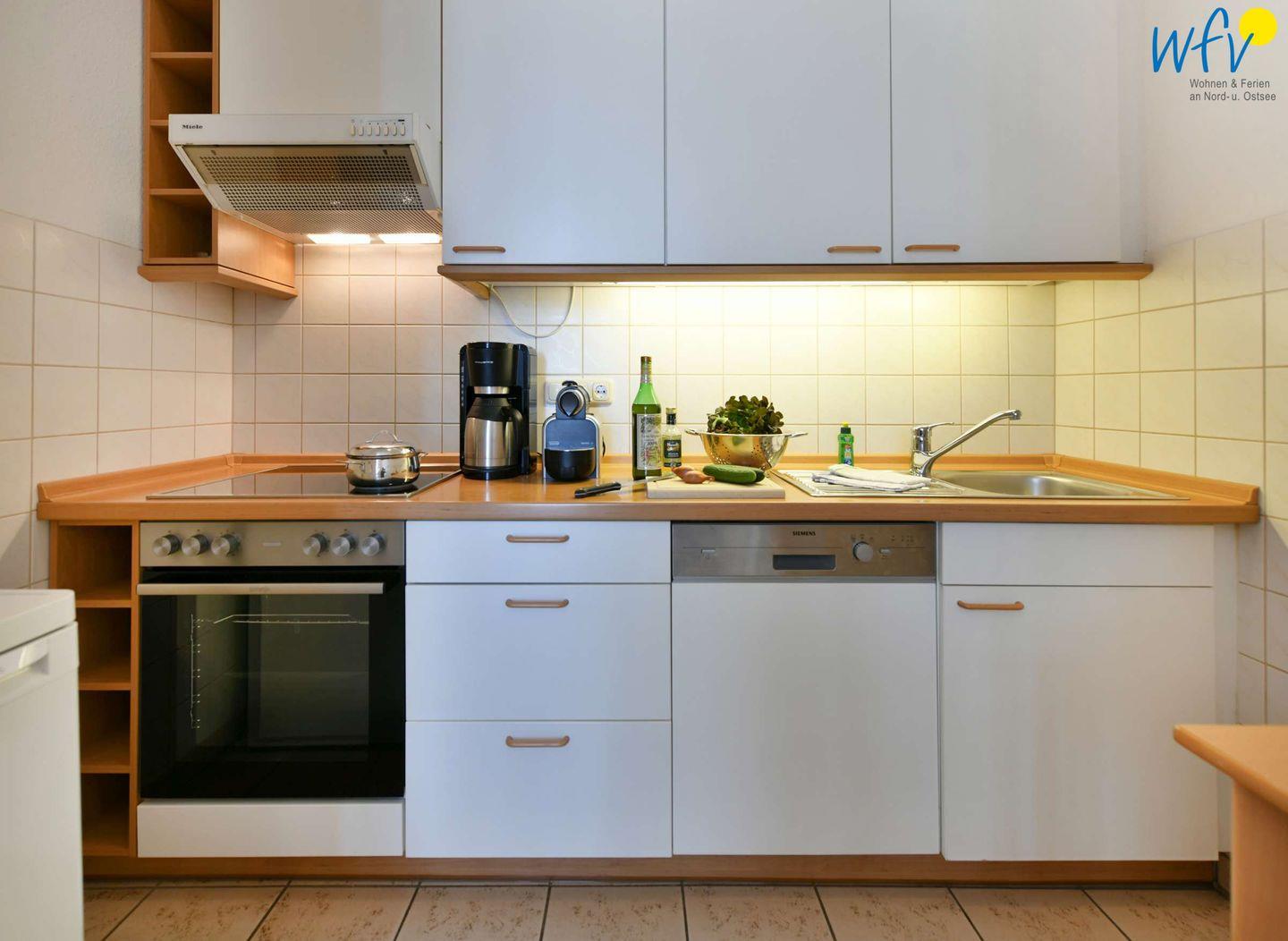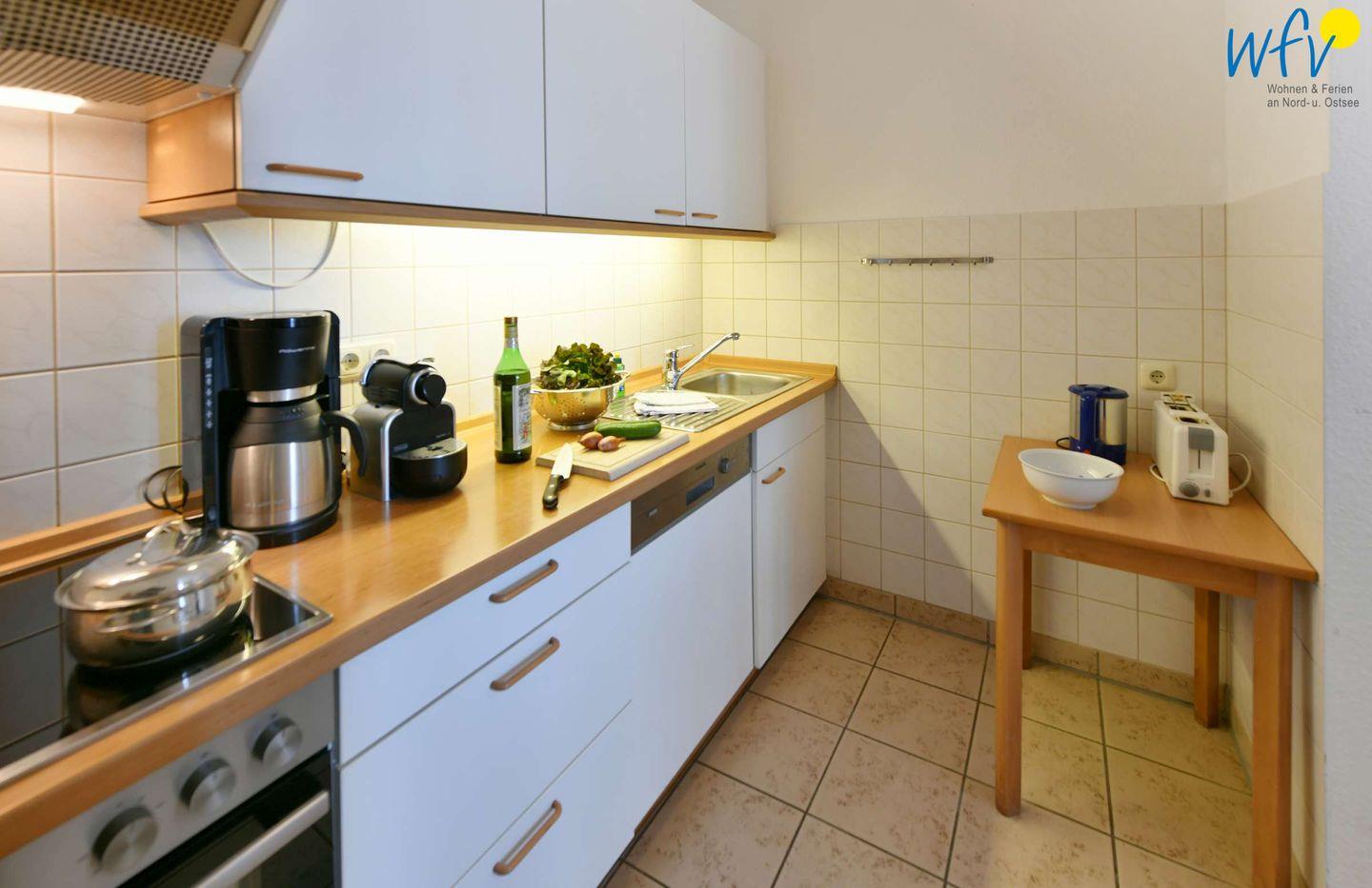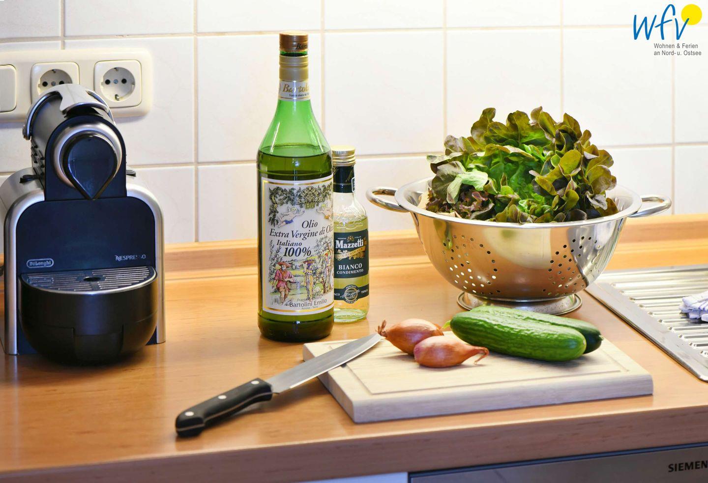Für eine bequeme Selbstverpflegung ist die Küchenzeile der Ferienwohnung u.a. mit einem 4-Plattenherd, Backofen und Kühlschrank mit Gefrierfach, Mikrowelle und Geschirrspüler ausgestattet. Kaffeeliebhaber können zwischen der klassischen Kaffeemaschine und einem Vollautomaten (mit Kapseln) wählen.