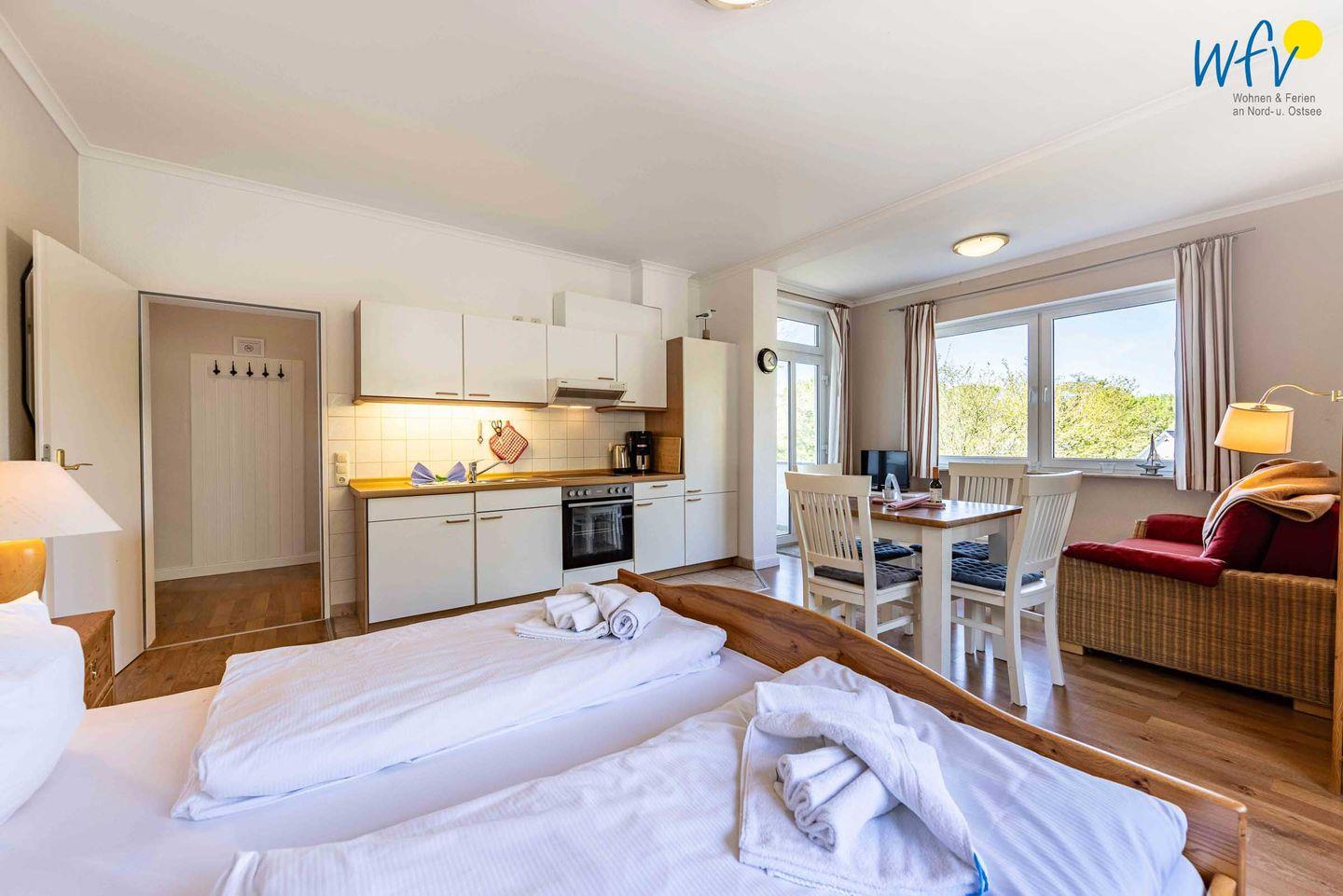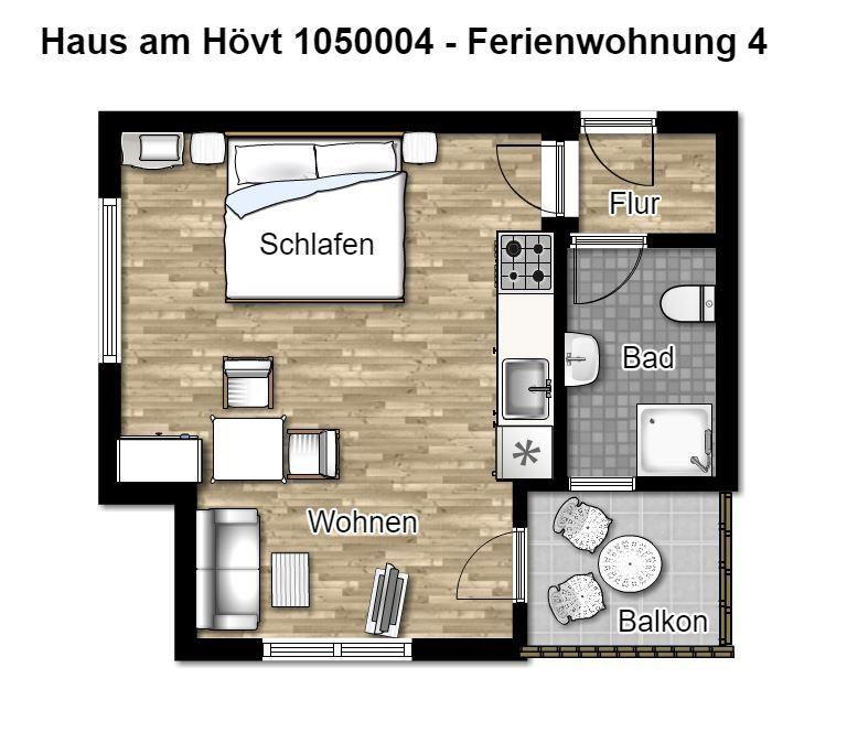 Unsere gemütliche Einraum-Ferienwohnung im "Haus am Hövt" ist ideal für romantische Tage zu zweit oder für den Urlaub mit der kleinen Familie! Auf 36 m² Wohnfläche erwartet Sie ein großzügiger Wohnraum mit Sitzecke, Esstisch, Doppelbett und integrierter Küchenzeile sowie ein Duschbad.