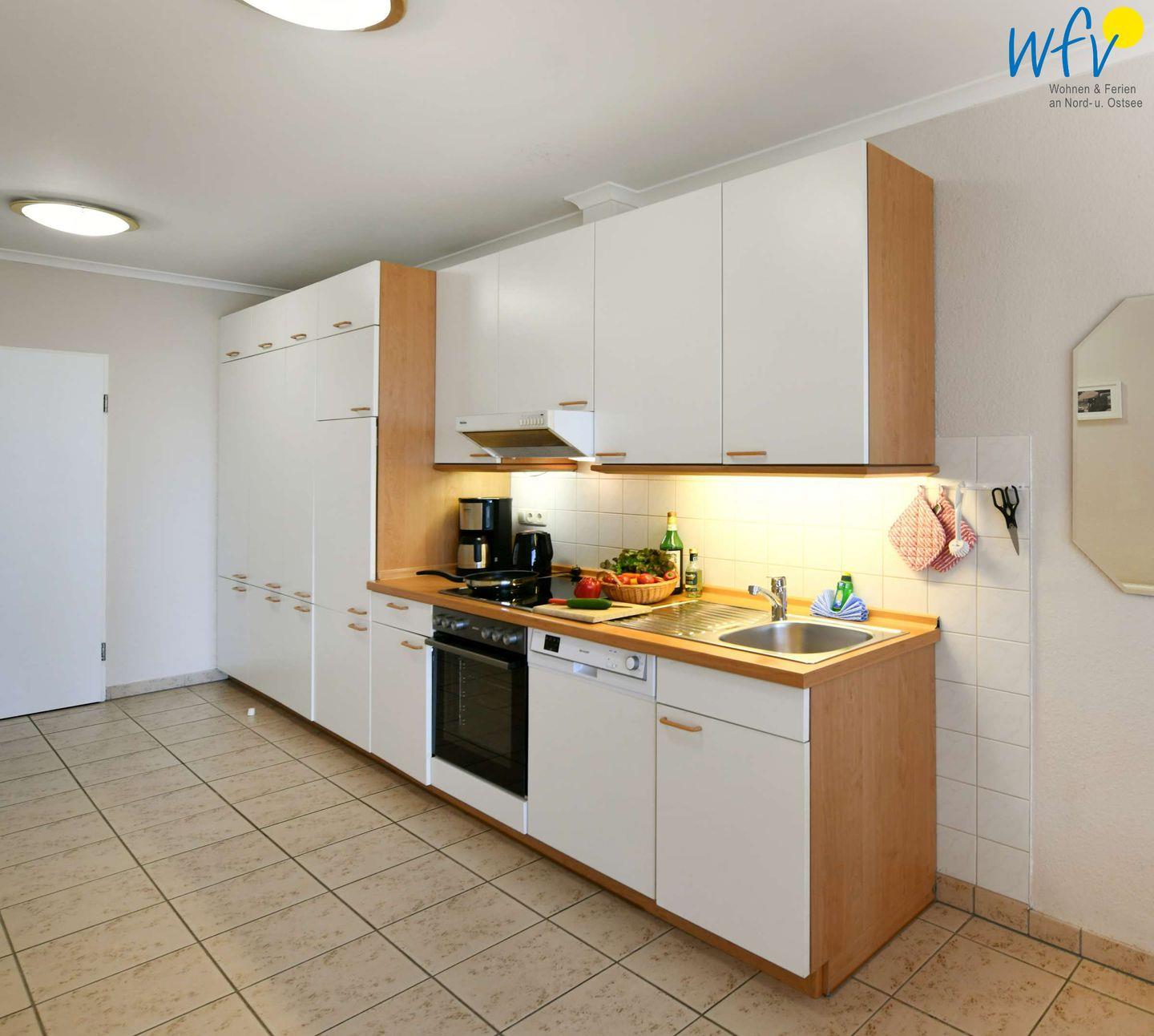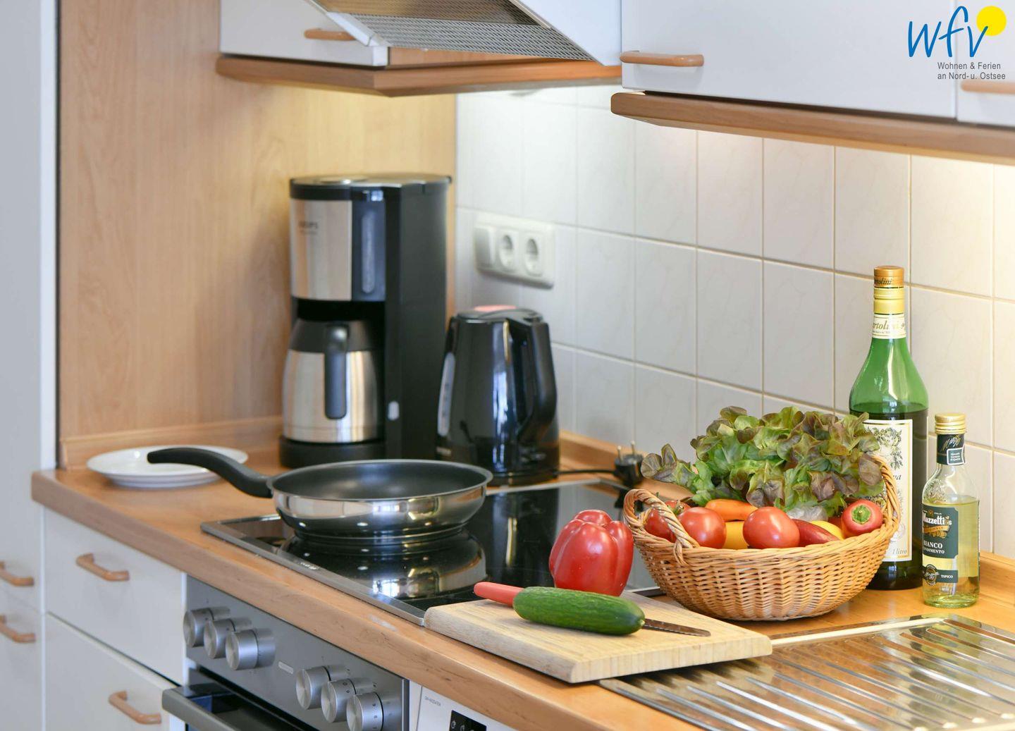 Damit Sie sich in Ihrem Urlaub auf Rügen bequem selbst verpflegen können, verfügt die Ferienwohnung über eine gut ausgestattete Küchenzeile u.a. mit Herd, Backofen, Kühlschrank mit Gefrierfach und Geschirrspüler sowie Kaffeemaschine, Wasserkocher und Toaster.