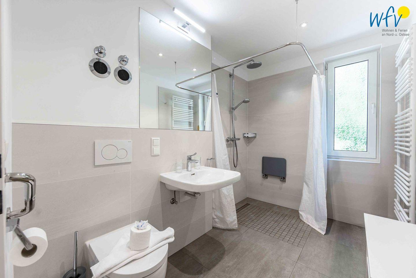 Eine breite Fensterfront, stilvolles Mobiliar und eine optimale Aufteilung mit großzügigem Wohnraum und separatem Schlafzimmer sorgen für eine besonders schöne Atmosphäre, in der Sie rundum entspannen können. Von der Ferienwohnung aus sehen Sie sogar bereits die Ostsee!