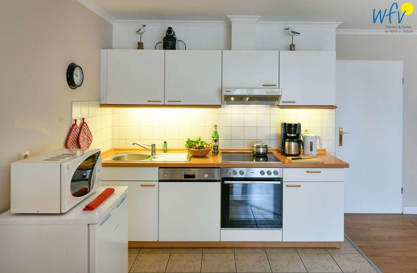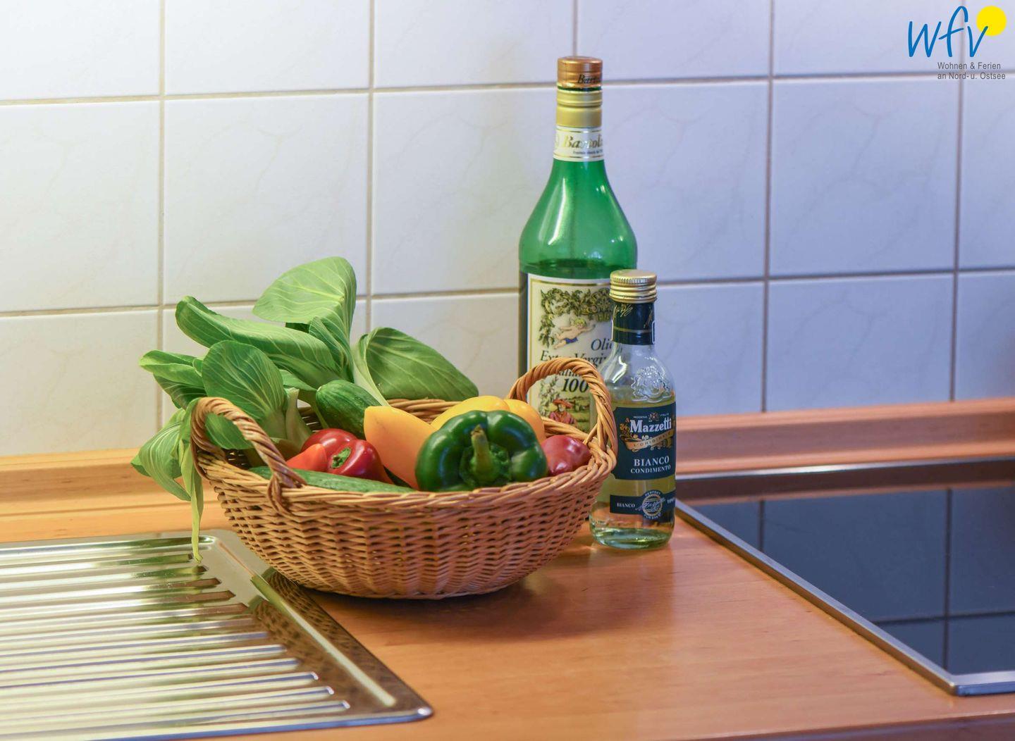 Damit Sie sich in Ihrem Urlaub auf Rügen bequem selbst verpflegen können, verfügt die Ferienwohnung über eine gut ausgestattete Küchenzeile u.a. mit Herd, Backofen, Kühlschrank mit Gefrierfach, Mikrowelle und Geschirrspüler sowie Wasserkocher und Toaster. Kaffeeliebhaber können zwischen der klassischen Kaffeemaschine und dem Kaffee-Vollautomaten (Kapseln) wählen.