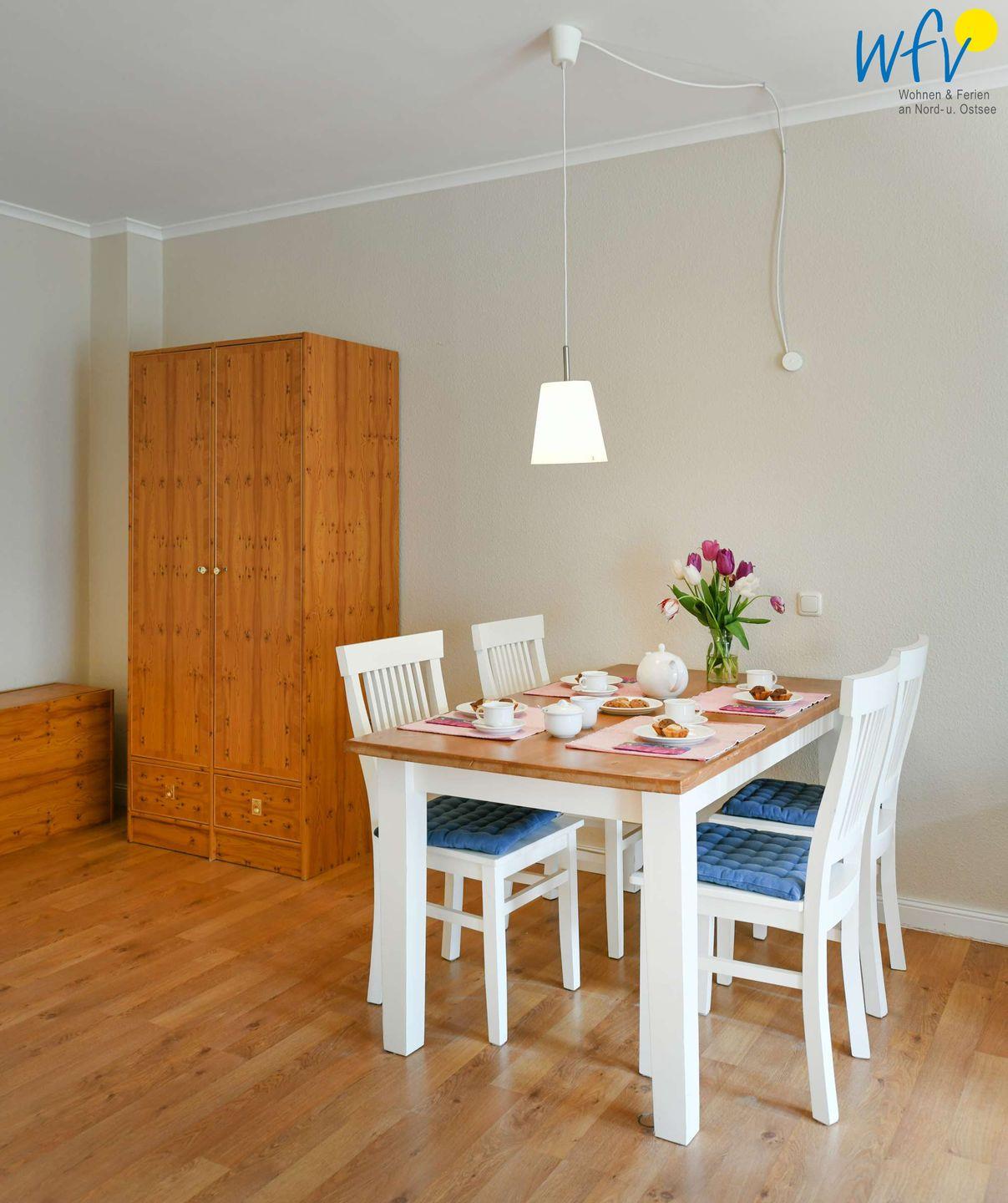 Ein großzügiger Wohnraum mit Couchecke, Essbereich und integrierter Küchenzeile sowie ein separates Schlafzimmer bieten Ihnen Platz für einen Urlaub zu zweit. Helle Räume, stilvolles Mobiliar und ein schöner Blick auf den Wald verleihen der Rügener Ferienwohnung viel Gemütlichkeit.