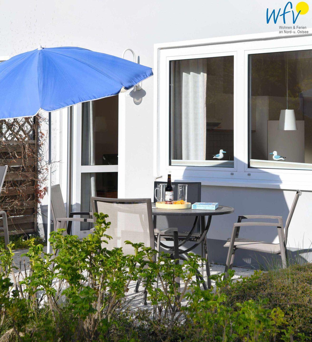 Wunderbar relaxen können Sie vor allem auf der möblierten Westterrasse! Zu der Ferienanlage „Haus am Hövt“ gehört zudem ein großer Gemeinschaftsgarten mit Grillplatz, Tischtennisplatte und Spielmöglichkeiten, den Sie gerne nutzen dürfen.