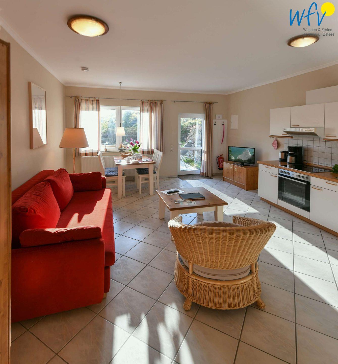 Ein großzügiger Wohnraum mit Couchecke, Esstisch, integrierter Küchenzeile und gemütlichem Schlafbereich bieten Ihnen Platz für die kleine Familie. Große Fenster, stilvolles Mobiliar und eine schöne Aussicht in den Garten verleihen der Rügener Ferienwohnung viel Gemütlichkeit.