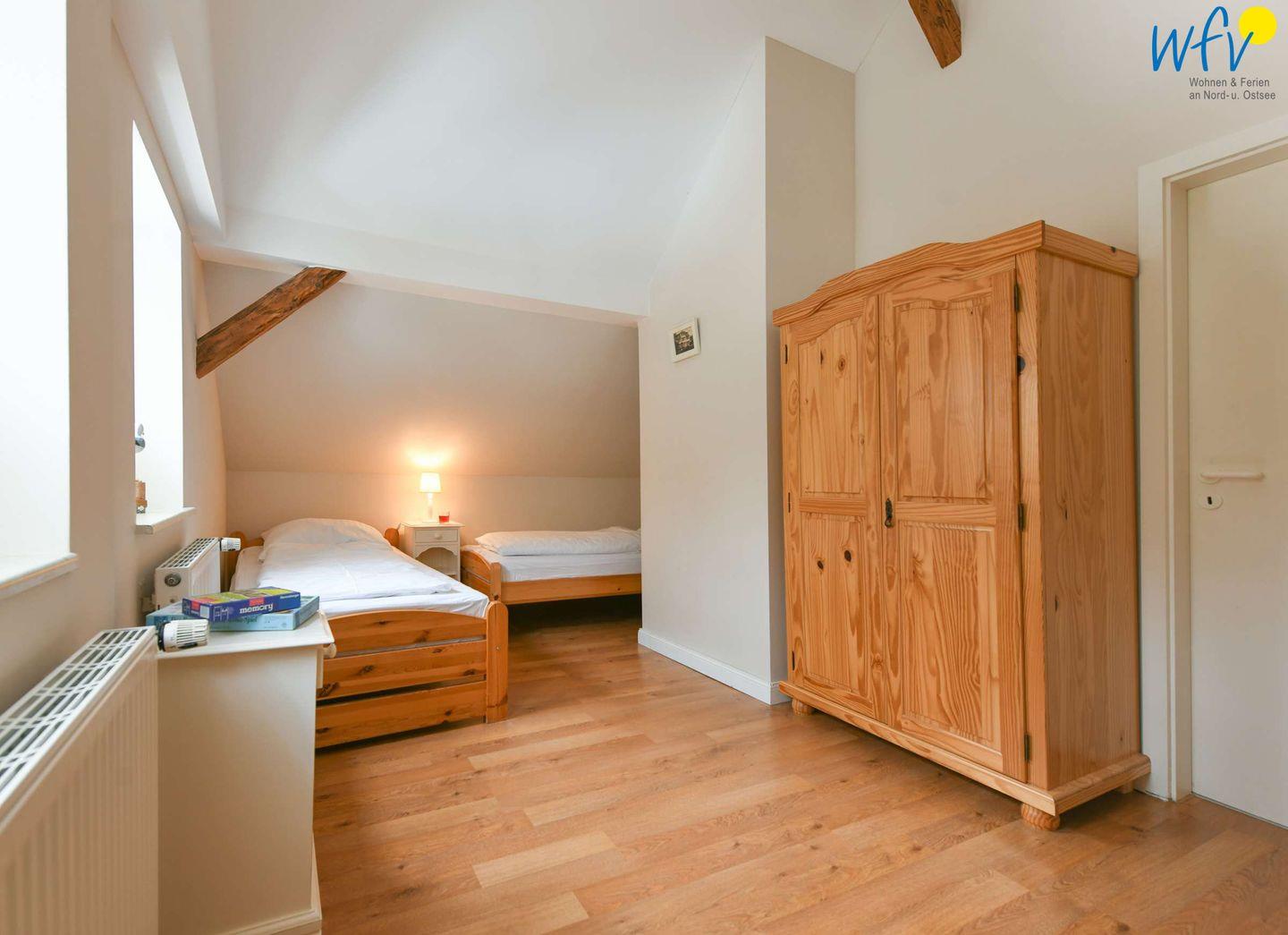 Im Erdgeschoss erwartet Sie ein Wohnraum mit gemütlicher Couchecke, Sesseln und modernem TV sowie eine Küche mit Essbereich. Im Obergeschoss befinden sich zwei separate Schlafzimmer, die mit einem Doppelbett (1,80 m x 2 m) bzw. zwei Einzelbetten (0,90 m x 2 m) ausgestattet sind. Eine Aufbettung ist möglich (auf Anfrage).