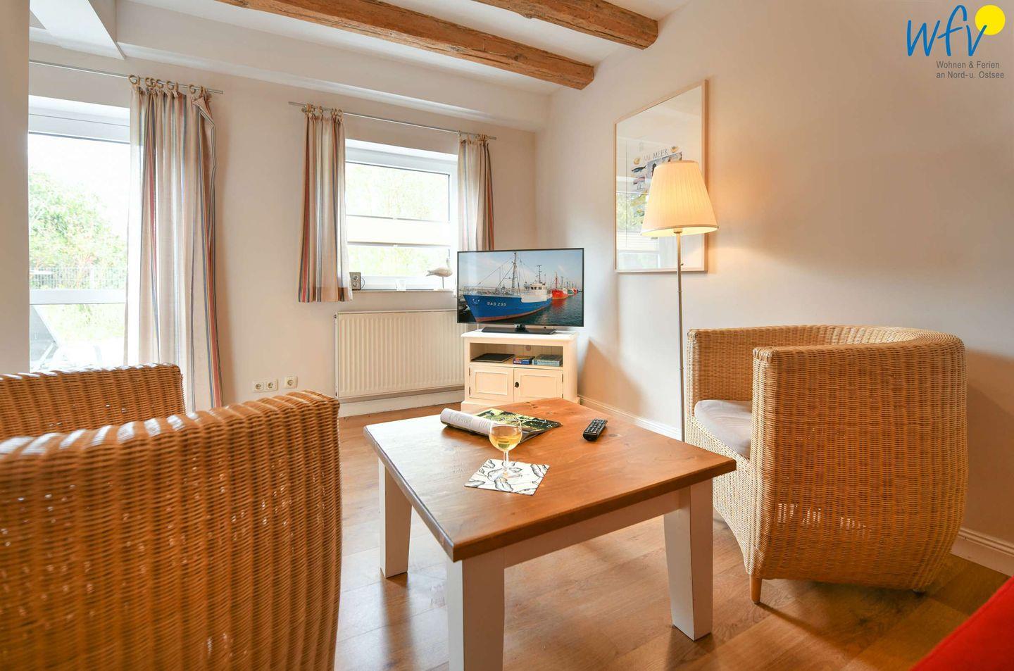 Helle Räume mit charmanter Holzbalkenoptik, stilvolles Mobiliar und eine schöne Aussicht in den Garten verleihen dem Rügener Ferienhaus viel Gemütlichkeit. Wunderbar relaxen können Sie auch auf der möblierten Westterrasse! Zu der Ferienanlage „Haus am Hövt“ gehört zudem ein großer Gemeinschaftsgarten mit Grillplatz, Tischtennisplatte und Spielmöglichkeiten, den Sie gerne nutzen dürfen.