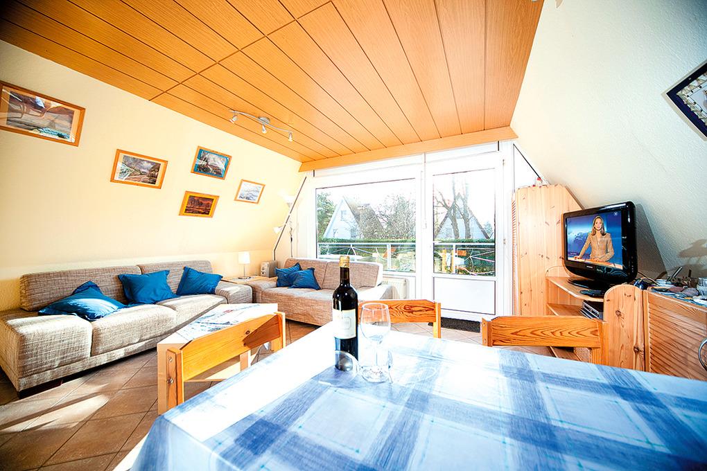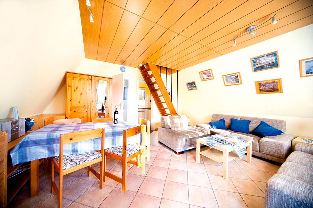 D 100.5 Finnhütte 2-5 Pers.: 3-Zimmerhaus in Steinbauweise, 50 qm Wohnfläche über 2 Etagen. Parterre: Gemütlicher Wohnraum mit Couchgarnitur, Esstisch, Sat-TV, DVD, Radio/CD, breiter Fensterfront. Kleine Küche mit Spülmaschine, Mikrowelle, Waschmaschine. Bad/WC. Steile Stiege in die 1. Etage (Dachschrägen): 2-Bettzimmer. 3-Bettzimmer. Zentralheizung. Terrasse mit Sitzmöbeln und Strandkorb.