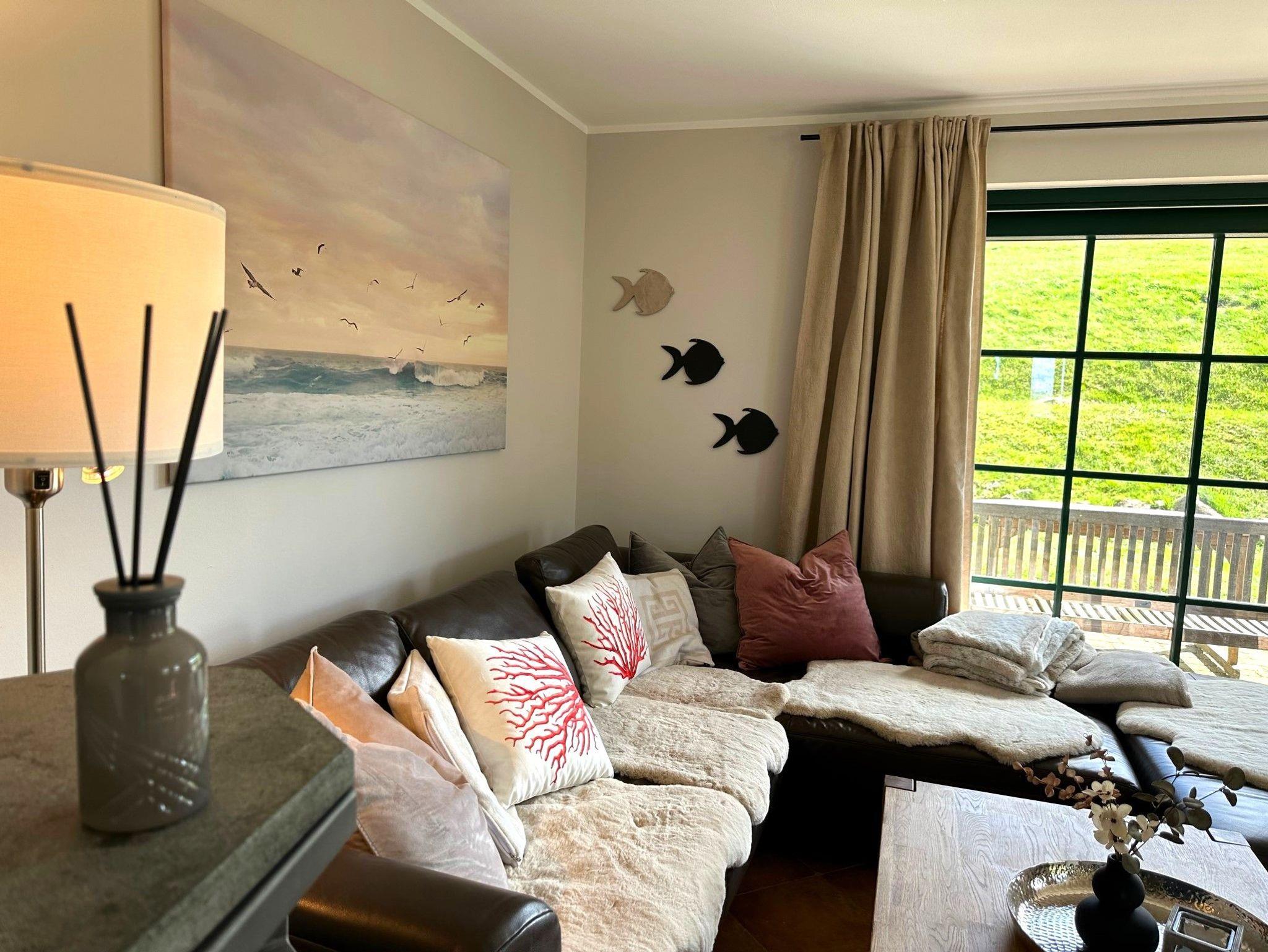 Vom Eingangsbereich aus führt eine Glastür ins Erdgeschoss, wo Sie den gemütlichen Wohn-, Küchen- und Essbereich vorfinden. Von dort aus gelangen Sie in den Garten mit Südterrasse und Blick auf das UNESCO-Naturschutzgebiet Zickersche Berge. Der offene Wohnraum ist mit einem hochwertigen Ledersofa ausgestattet. Der Kaminofen verbreitet eine gemütliche Wärme, besonders nach langen Spaziergängen in der kalten Jahreszeit.