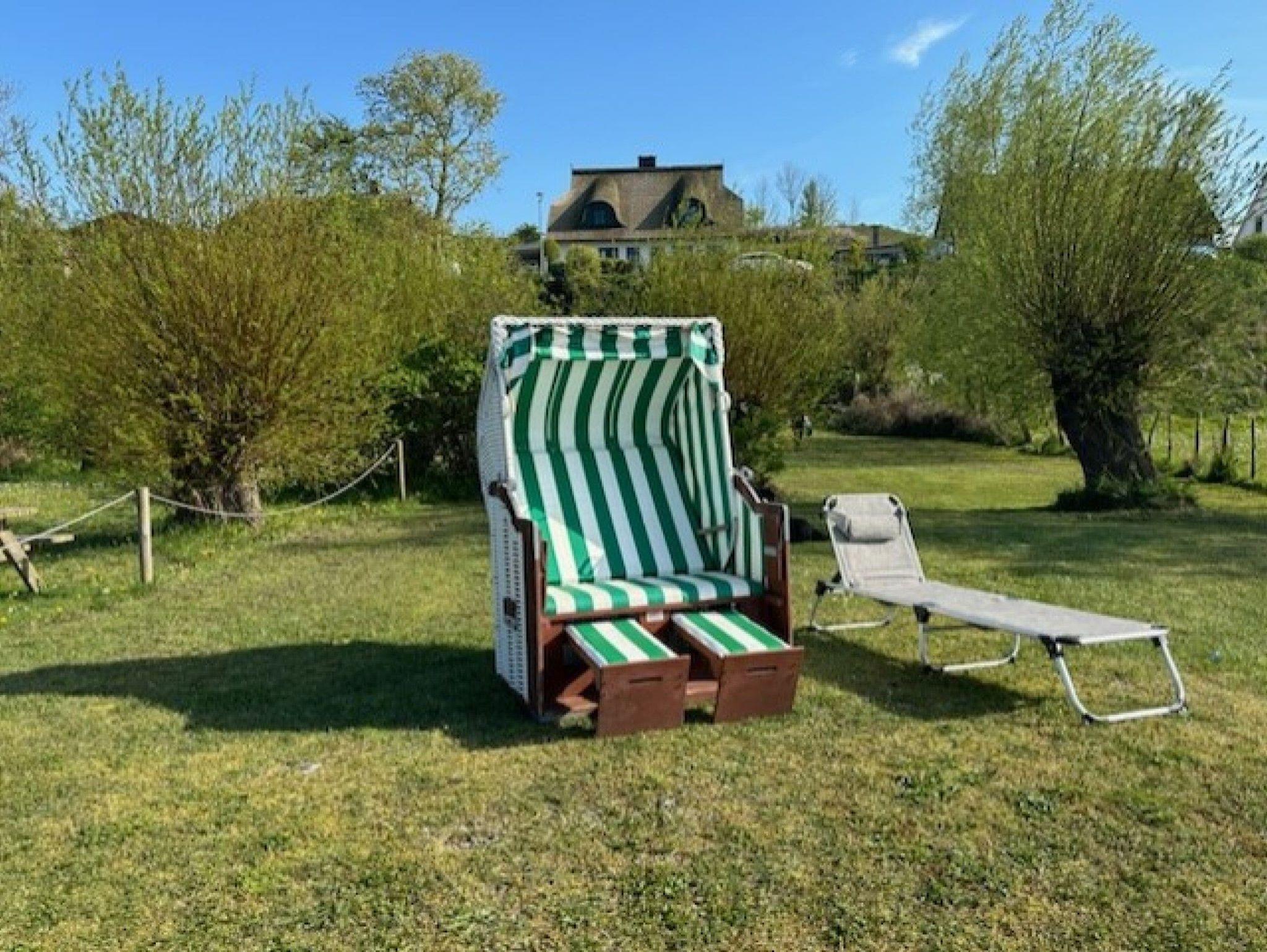 Der private Wasserzugang zum Bodden ist etwa 100 m vom Haus entfernt und über eine Treppe erreichbar. Hier können Sie sich in Ihrem eigenen Strandkorb erholen. Das großzügige Grundstück bietet großen und kleinen Gästen die Möglichkeit, viele Aktivitäten direkt vom Haus aus zu unternehmen. Der Bodden ist eine ruhige Bucht der Ostsee und somit ideal zum gefahrlosen Planschen als auch zum Ausüben diverser Wassersportarten. Am Wasser stehen Ihnen zusätzlich ein Strandkorb und zwei Sonnenliegen zur Verfügung, je nach Wetterlage etwa von Mai bis Anfang Oktober. Eine Treppe führt direkt zum Wasser. Das Grundstück ist NICHT eingezäunt!