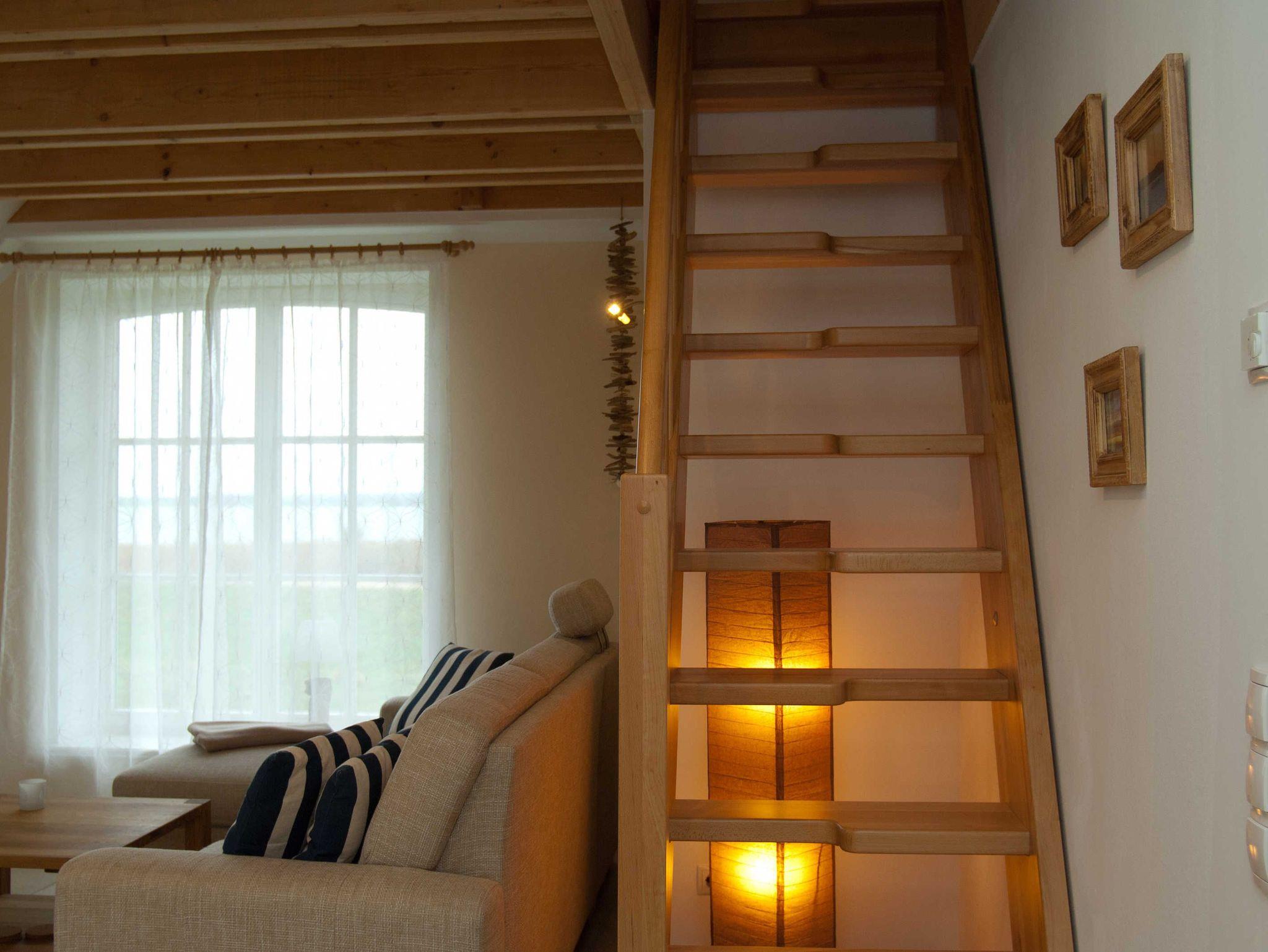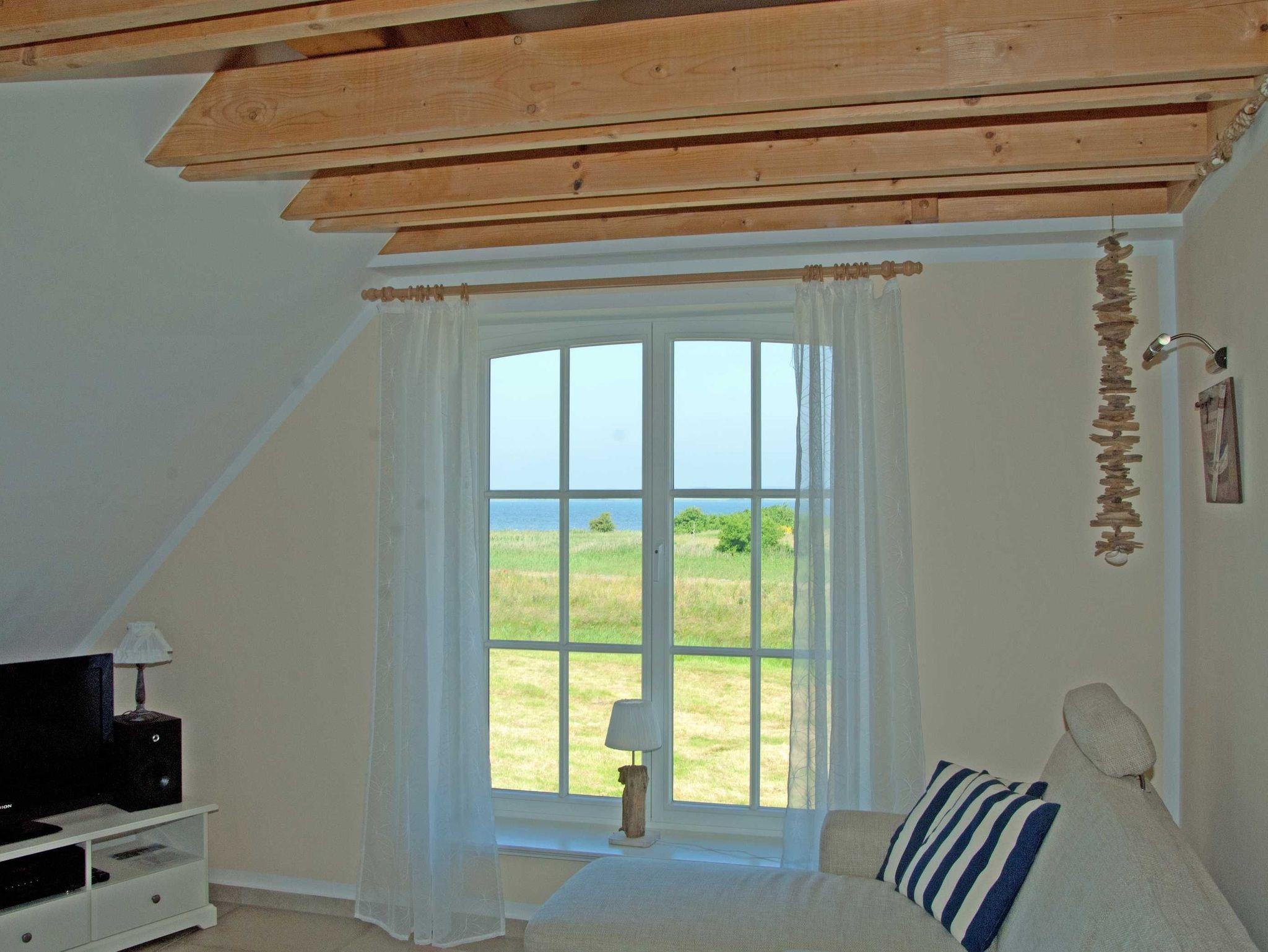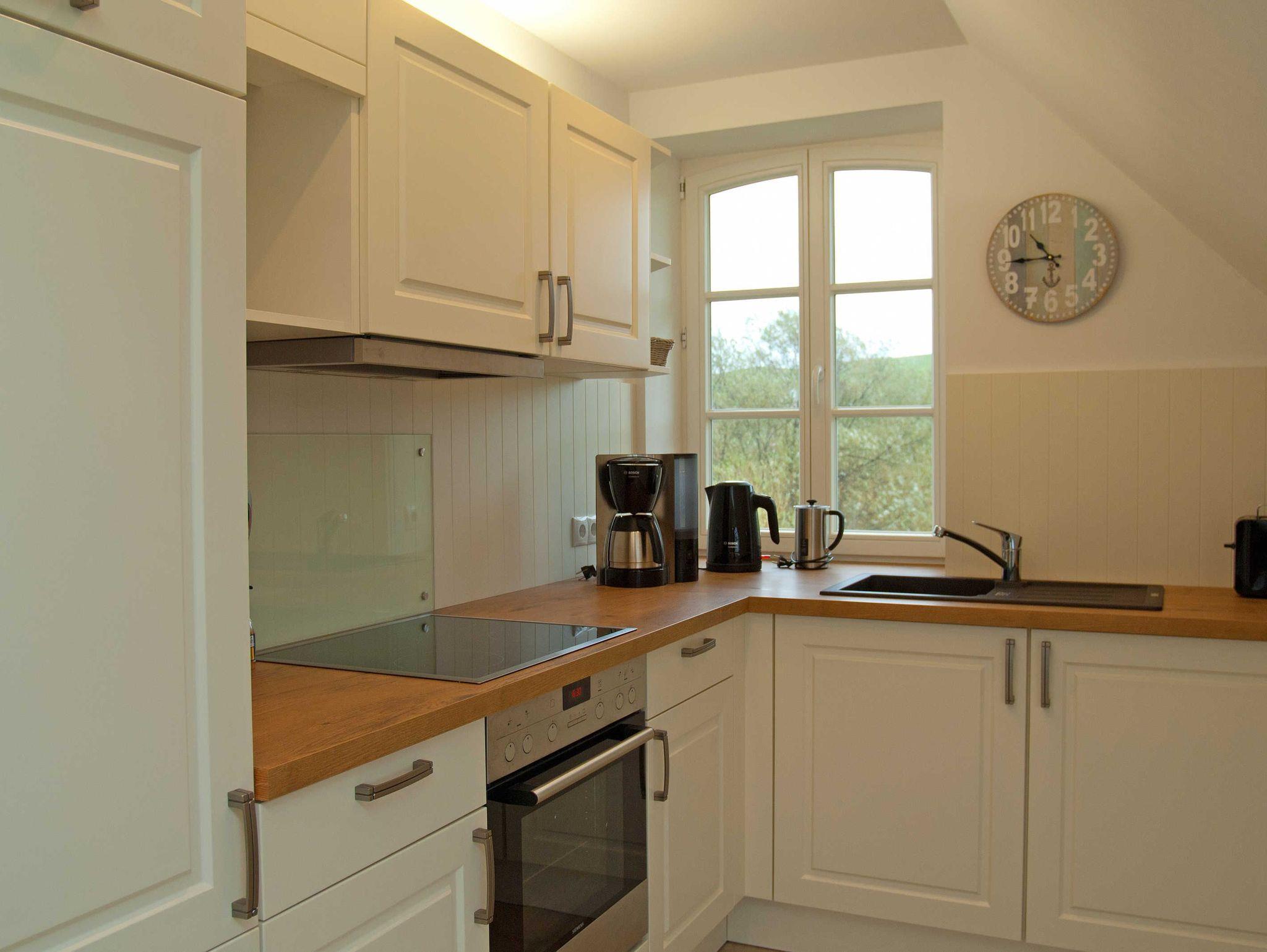 Die wunderschöne Küche im Landhaus Stil ist mit hochwertigen Markengeräten ausgestattet. Ein großer Esstisch bietet Platz für gemütliche Abende mit weitem Ausblick bis hin zur Insel Vilm. Die beiden Schlafbereiche sind mit Doppelbetten und Flachbild-TV ausgestattet. Den besonders gemütlichen Schlafbereich im Spitzboden erreicht man über eine Treppe vom Wohnzimmer.