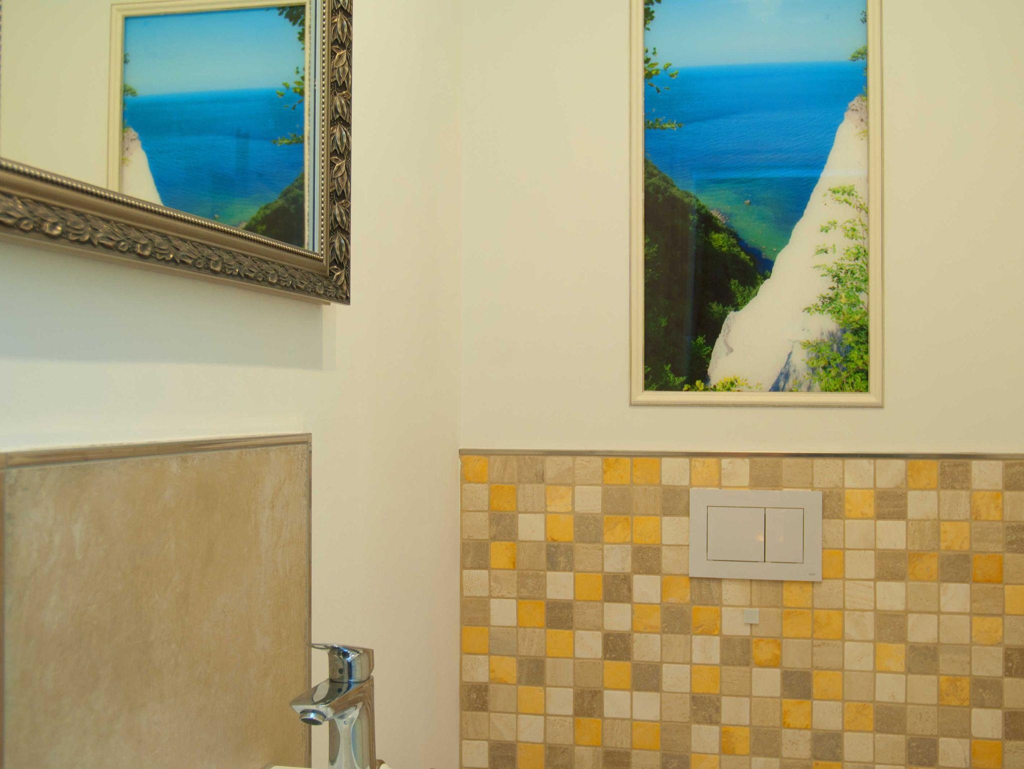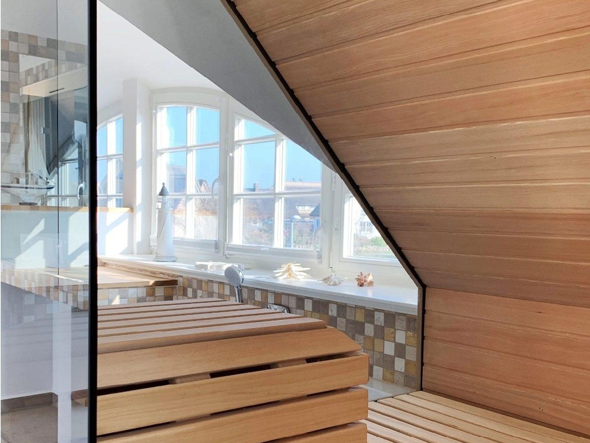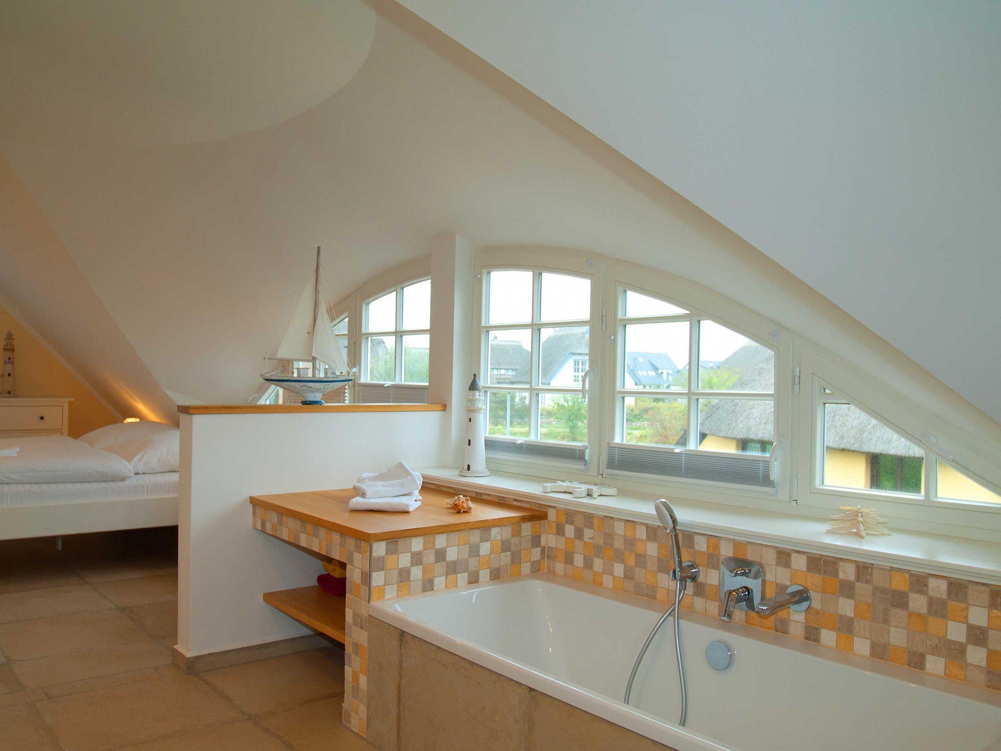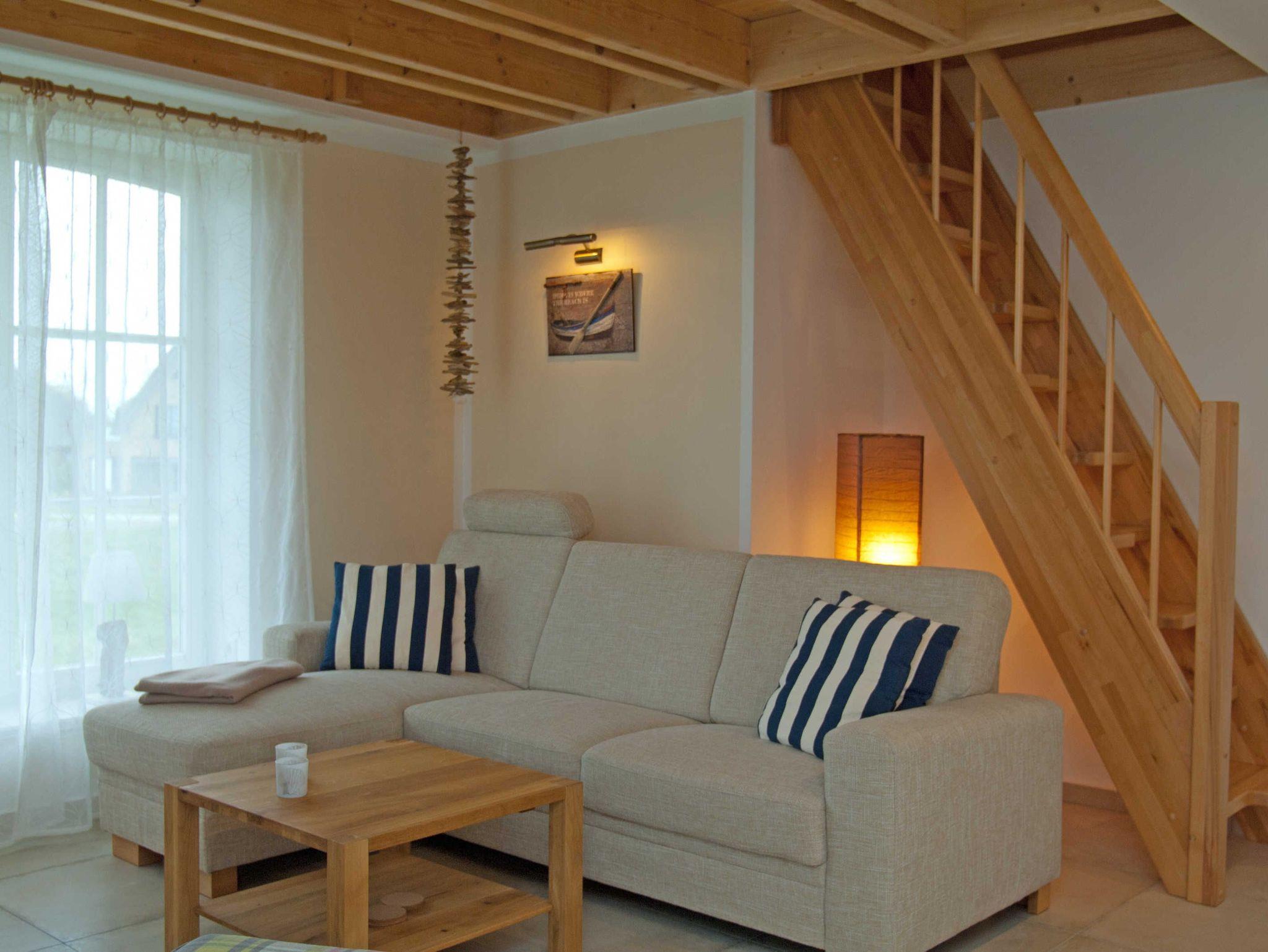 Die wunderschöne Küche im Landhaus Stil ist mit hochwertigen Markengeräten ausgestattet. Ein großer Esstisch bietet Platz für gemütliche Abende mit weitem Ausblick bis hin zur Insel Vilm. Die beiden Schlafbereiche sind mit Doppelbetten und Flachbild-TV ausgestattet. Den besonders gemütlichen Schlafbereich im Spitzboden erreicht man über eine Treppe vom Wohnzimmer.
