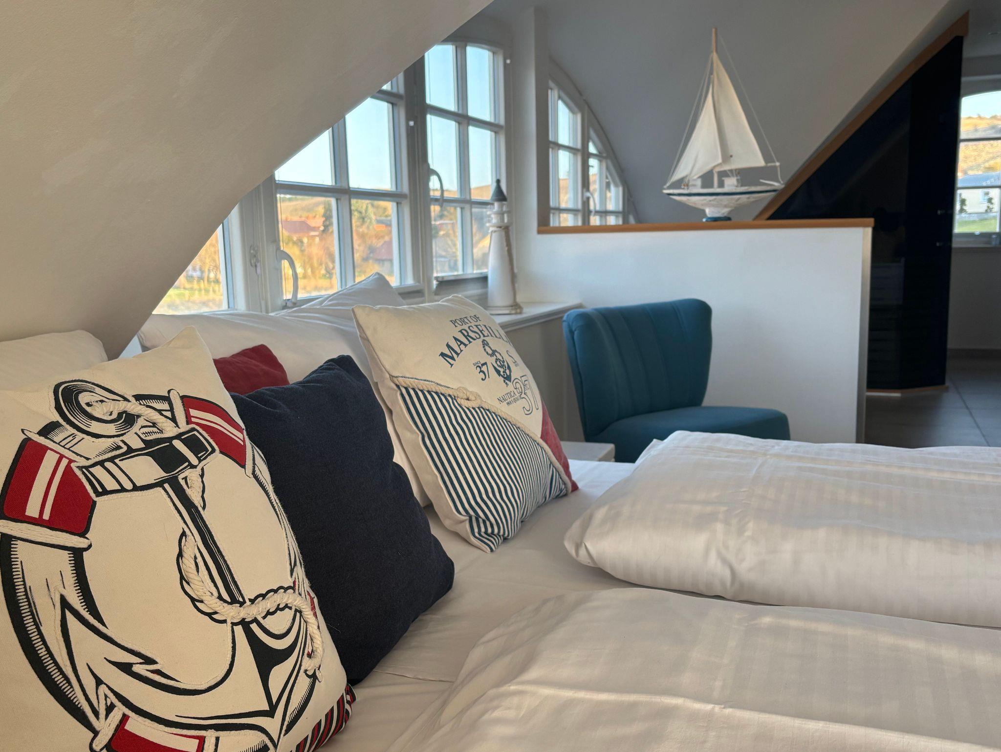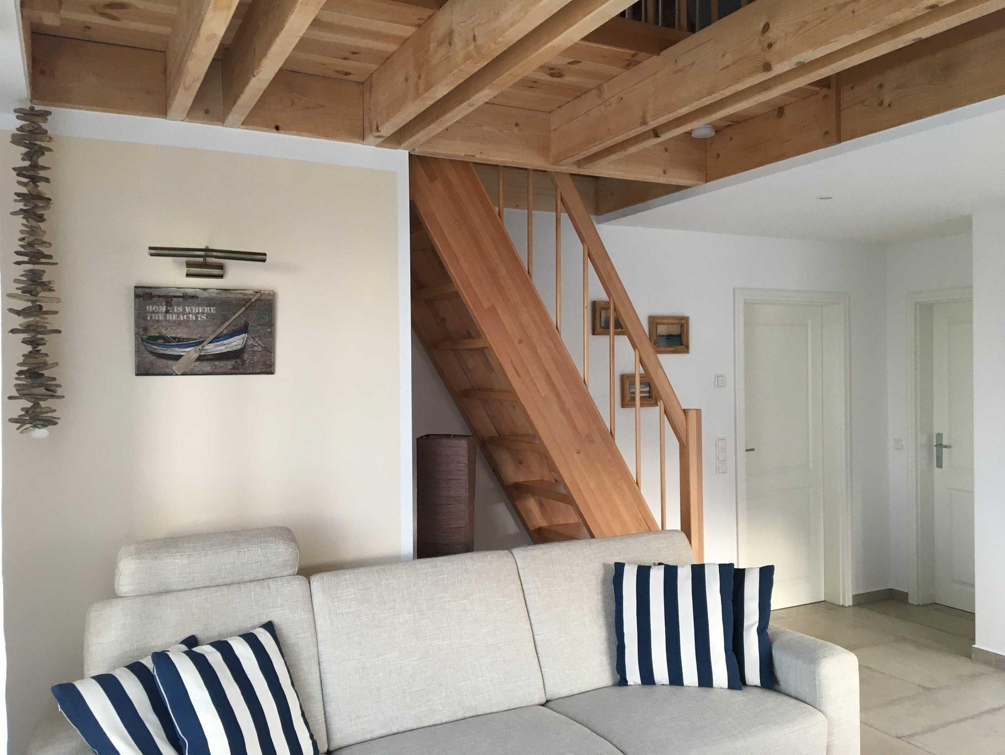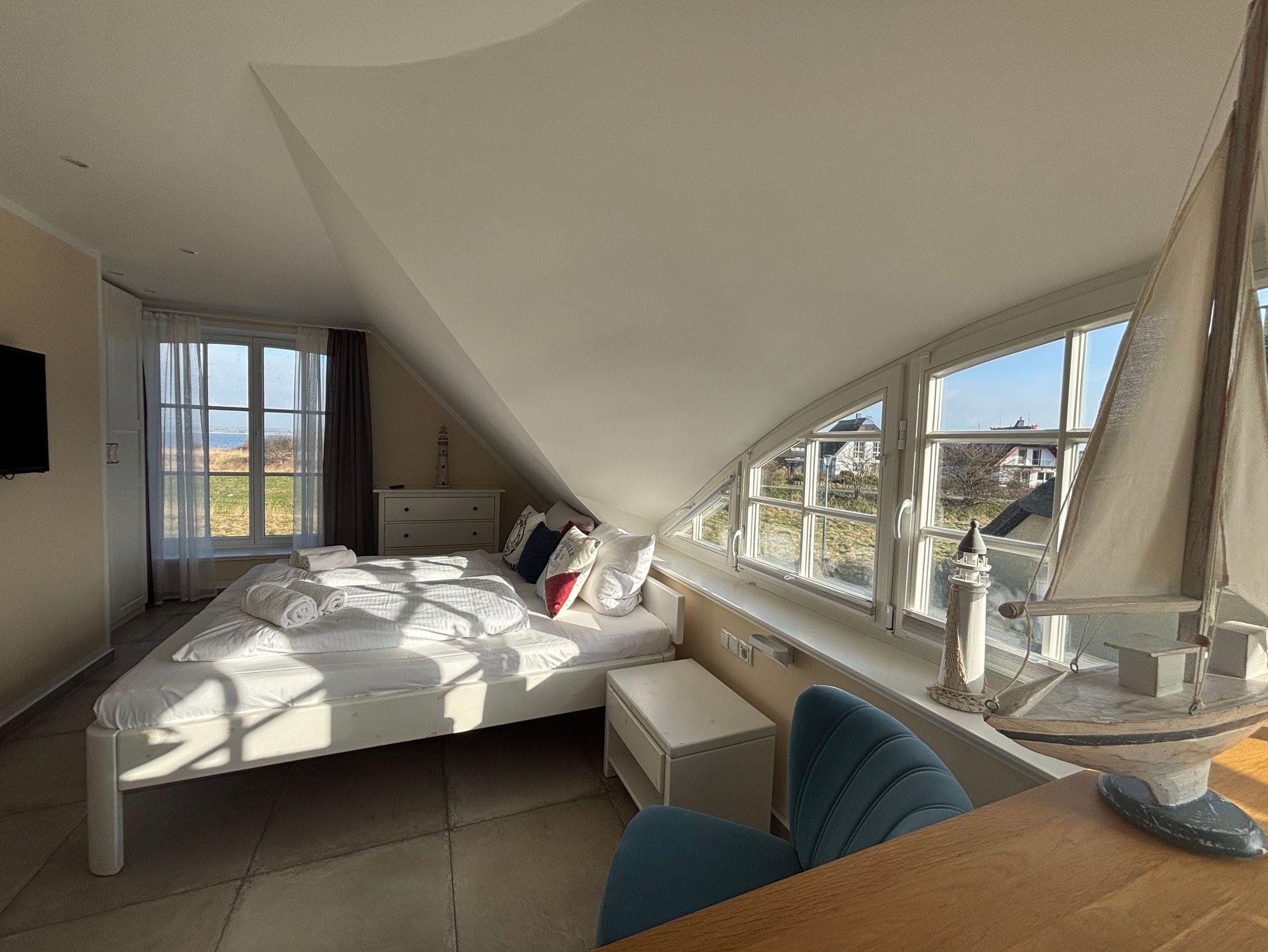 Die liebevoll eingerichtete Ferienwohnung Vilmblick (DG) mit ausgebautem Spitzboden, verfügt über einen großzügigen und maritim eingerichteten Wohnbereich mit einladenden Fledermausgauben für einen außergewöhnlichen Rundumblick für bis zu vier Personen.