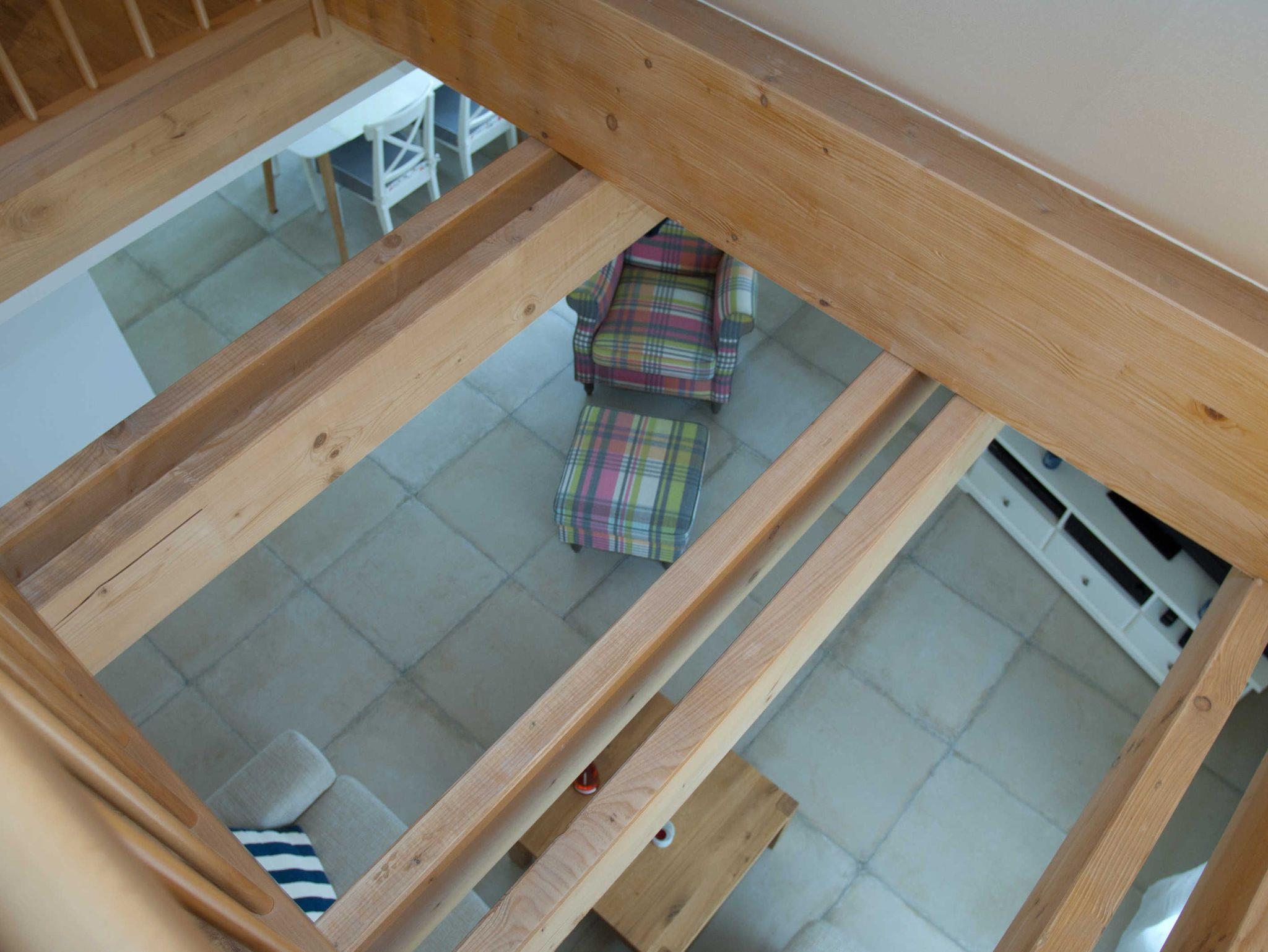 Die im Wohnbereich offene Zwischendecke mit freiliegenden Balken ist das Highlight dieser Wohnung. Zum luxuriös ausgestattete Bad mit großer ebenerdiger Regendusche gehört eine große Badewanne und ausreichend Platz. Das nicht im Bad befindliche WC ist von beiden Schlafbereichen separat zugänglich.