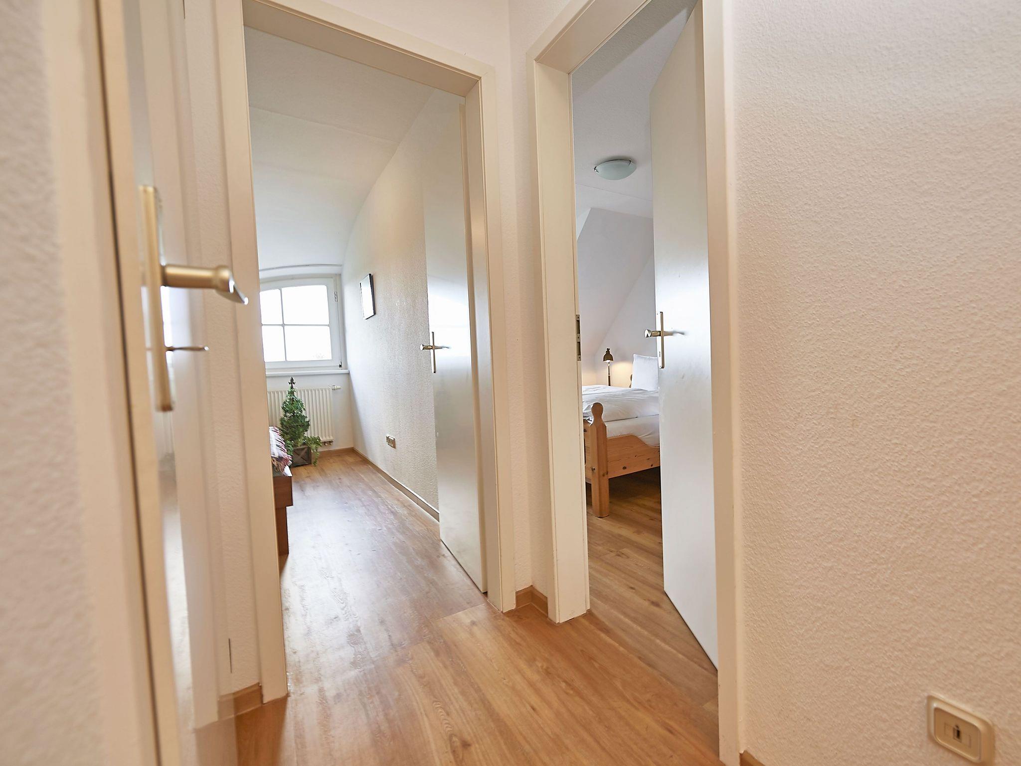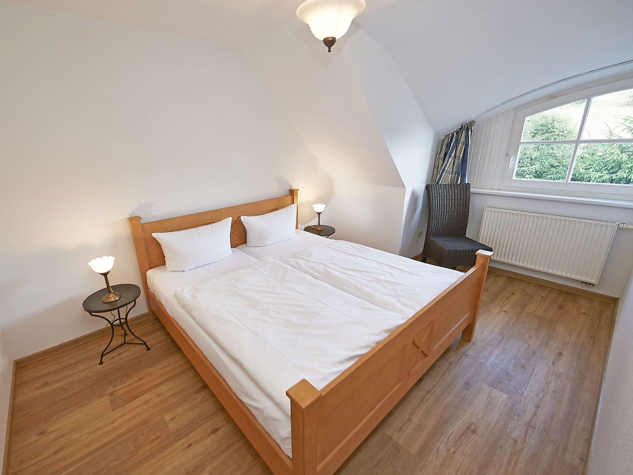 Im Obergeschoss der Wohnung findet man ein zweites Bad mit Badewanne und zwei Waschbecken, ein Schlafzimmer mit einem Doppelbett und Ankleidezimmer sowie zwei weitere Schlafzimmer mit je einem Doppelbett (1,80 x 2,00 m bzw. 1,60 x 2,00 m). Von zweien der Schlafzimmer genießt man ebenfalls den Blick zum Boddengewässer.