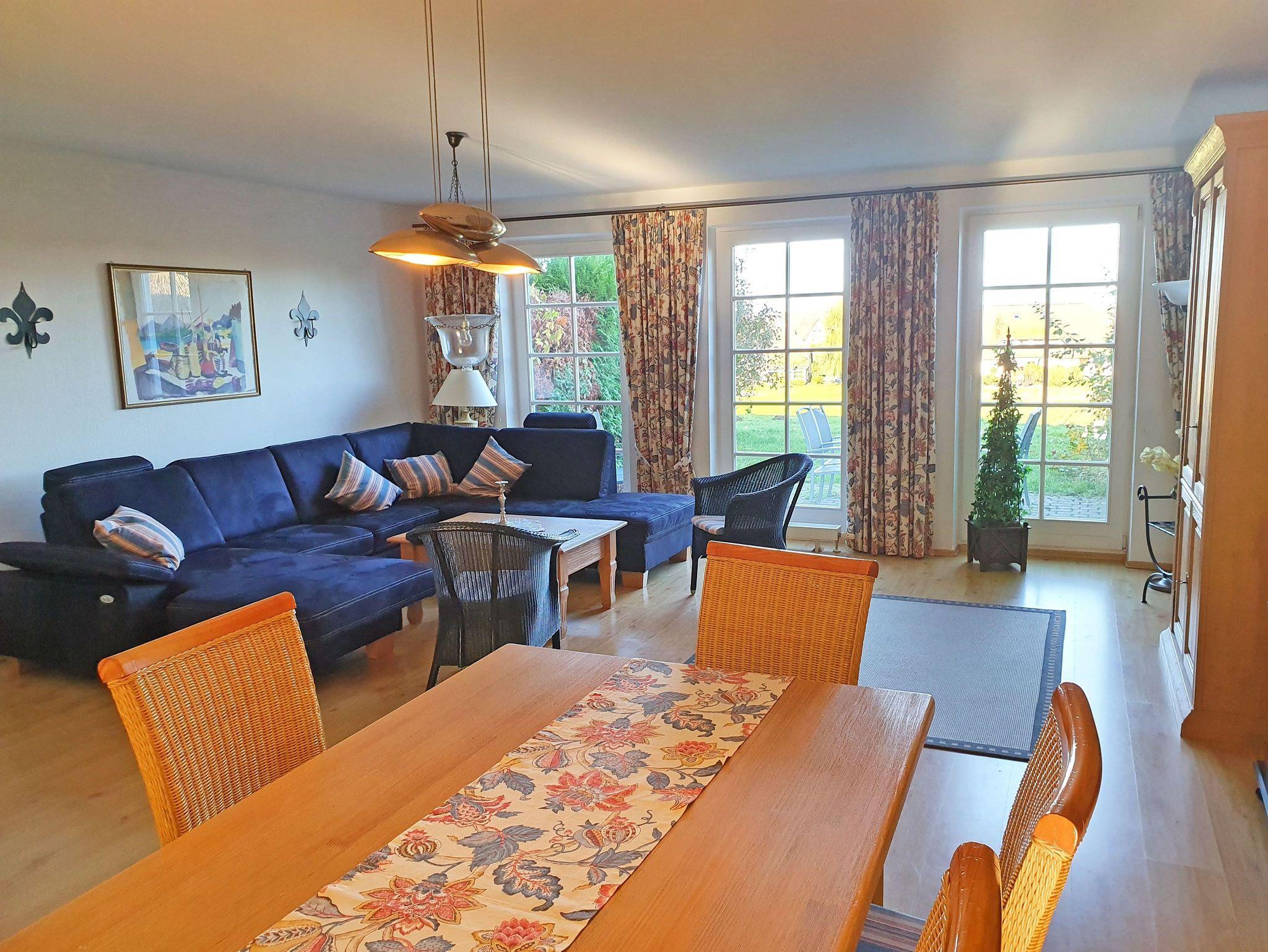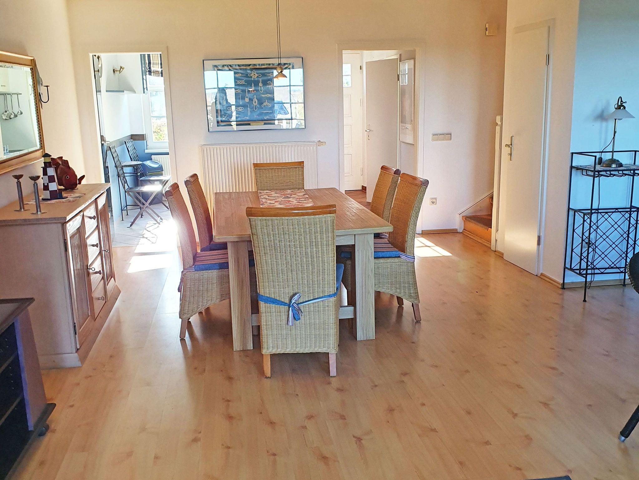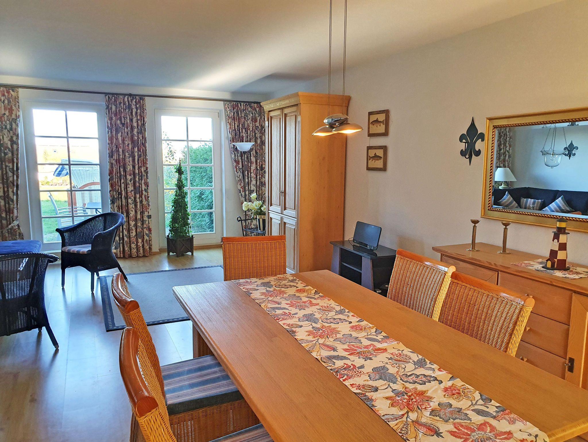 Die Ferienwohnung mit ca. 116 m² Wohnfläche ist über zwei Ebenen verteilt und hat eine möblierte Terrasse mit Strandkorb und Boddenblick. Im Erdgeschoss verfügt die sehr schöne und helle Wohnung über ein Wohn-/Esszimmer mit einem Esstisch für sechs Personen, einer gemütlichen Couchecke mit einem Kaminofen, TV, Stereoanlage mit CD-Player.